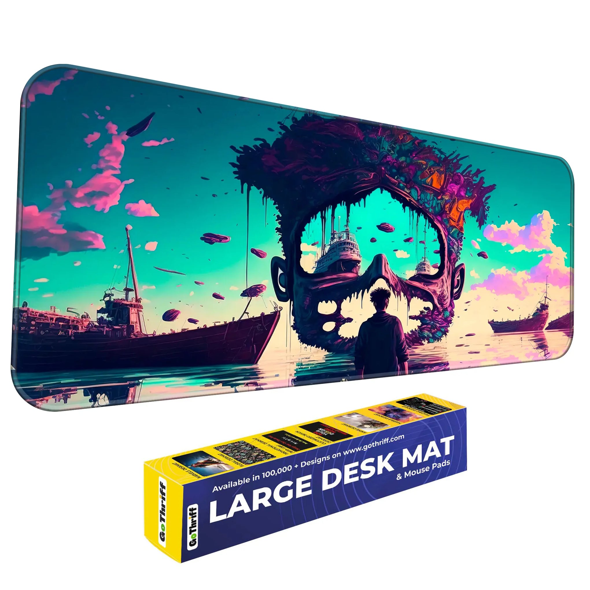 Step into the unknown with our Dreamcore Shipwreck Skull Desk Mat, a mind-bending portal into surreal seascapes and subconscious voyages. This one-of-a-kind art piece captures a hauntingly beautiful scene—where decaying ships drift inside the hollowed eyes of a gigantic skull made of melting dreams, neon florals, and twisted wreckage.