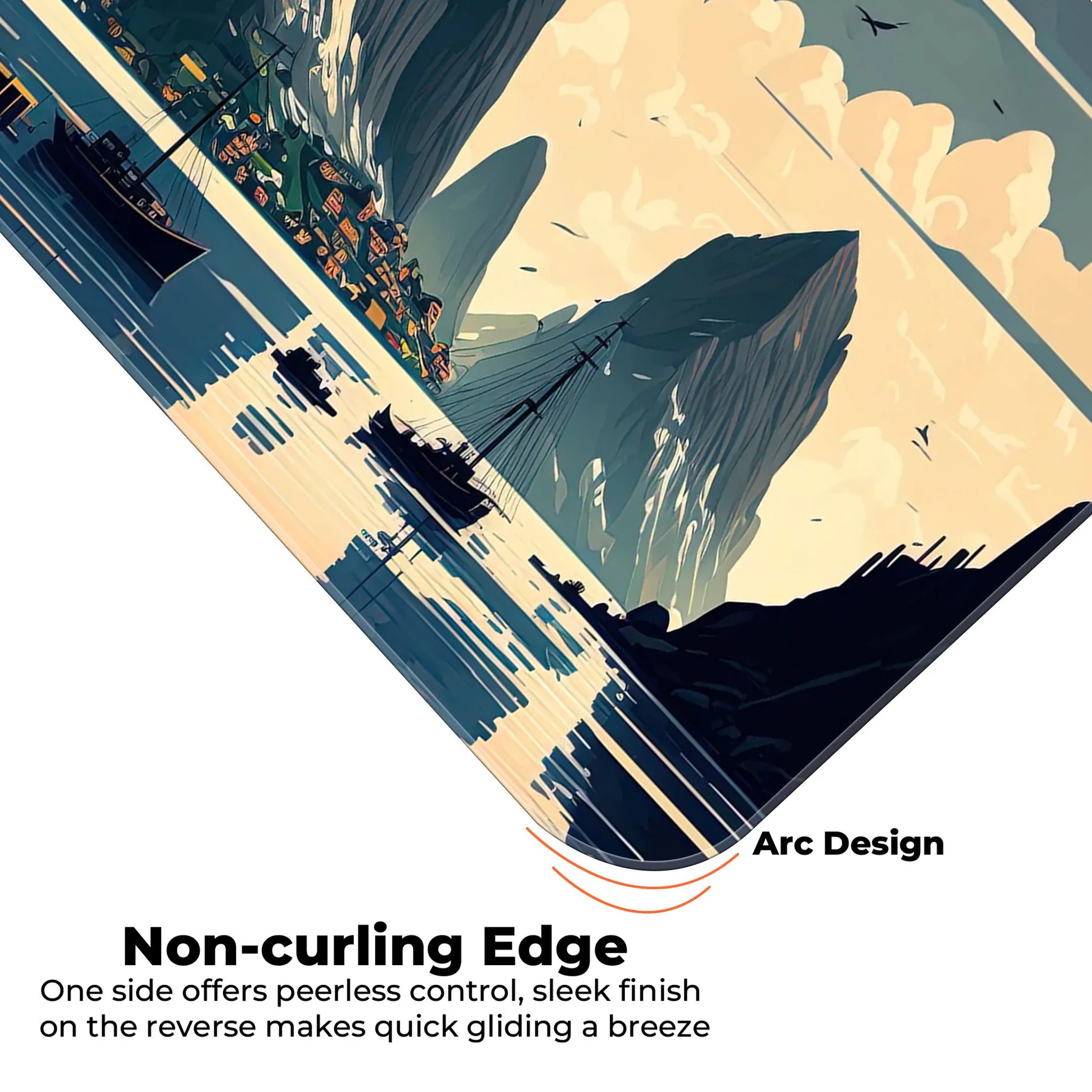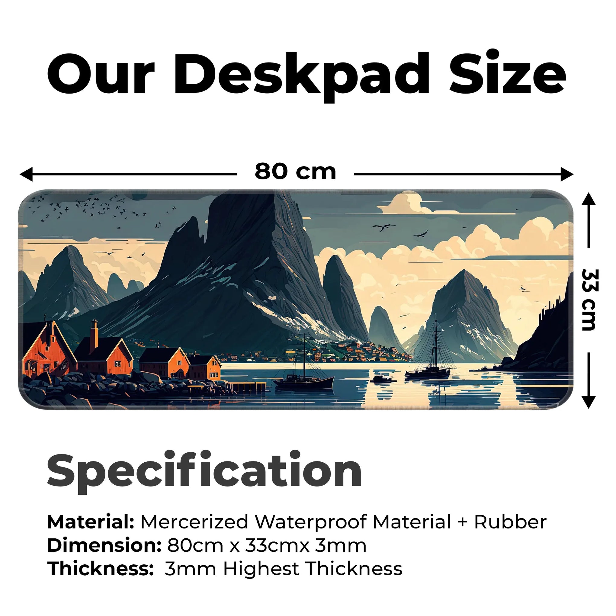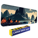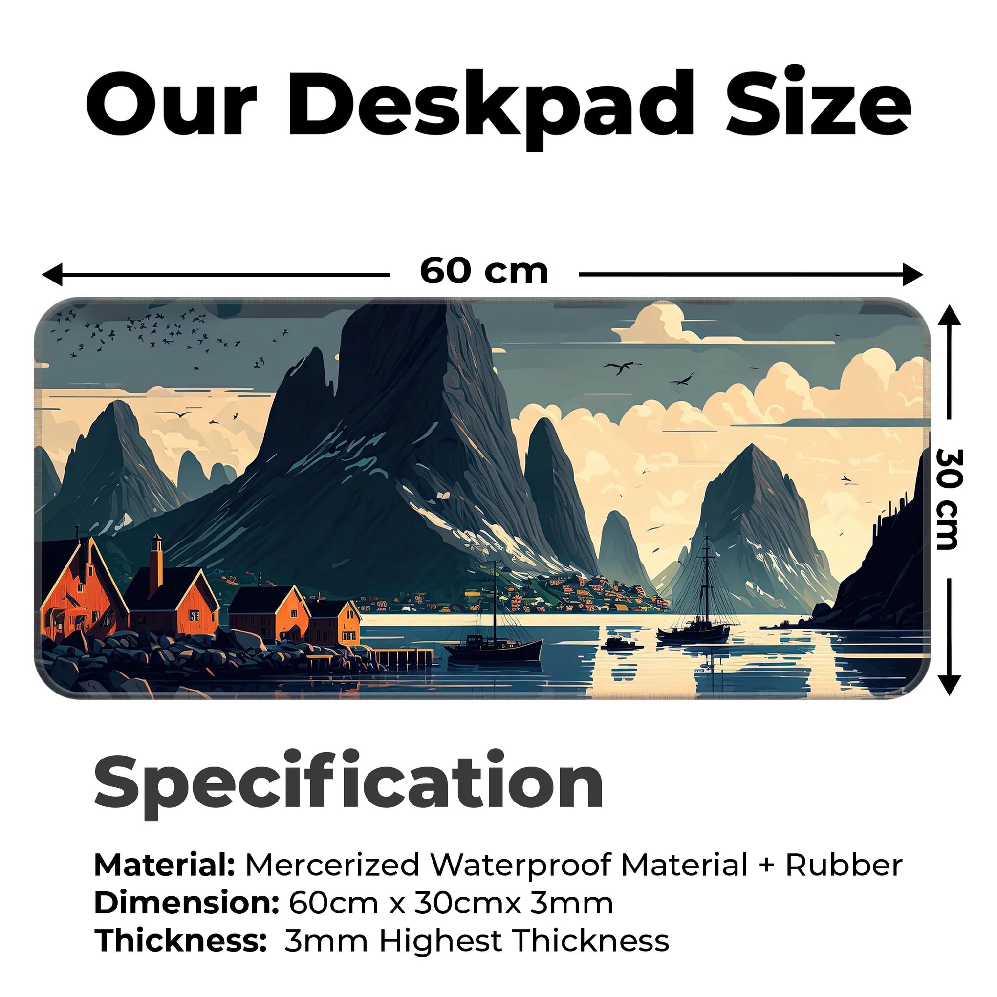 Transform your desk into a scenic escape with our Nordic Fjord Serenity Desk Mat, inspired by the dramatic beauty of Norway’s coastal villages. Towering dark mountains stretch into dreamy skies as quaint red cabins sit peacefully along the rocky shoreline. In the calm waters, sailboats and fishing vessels drift in the golden reflection of the sky – it’s pure visual poetry.