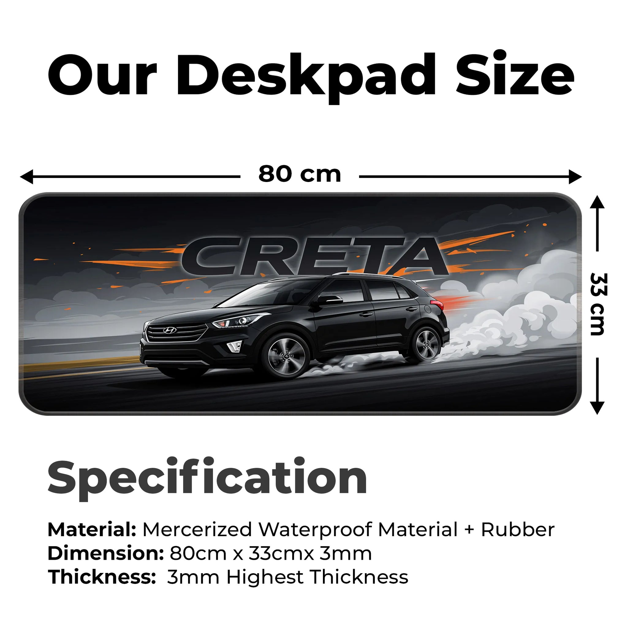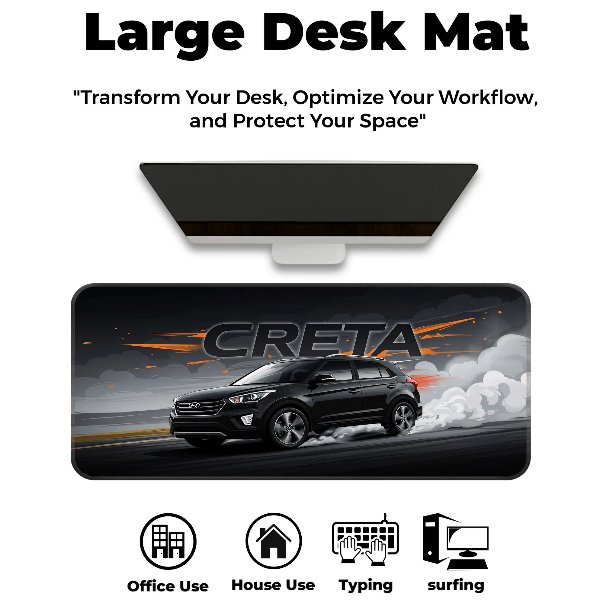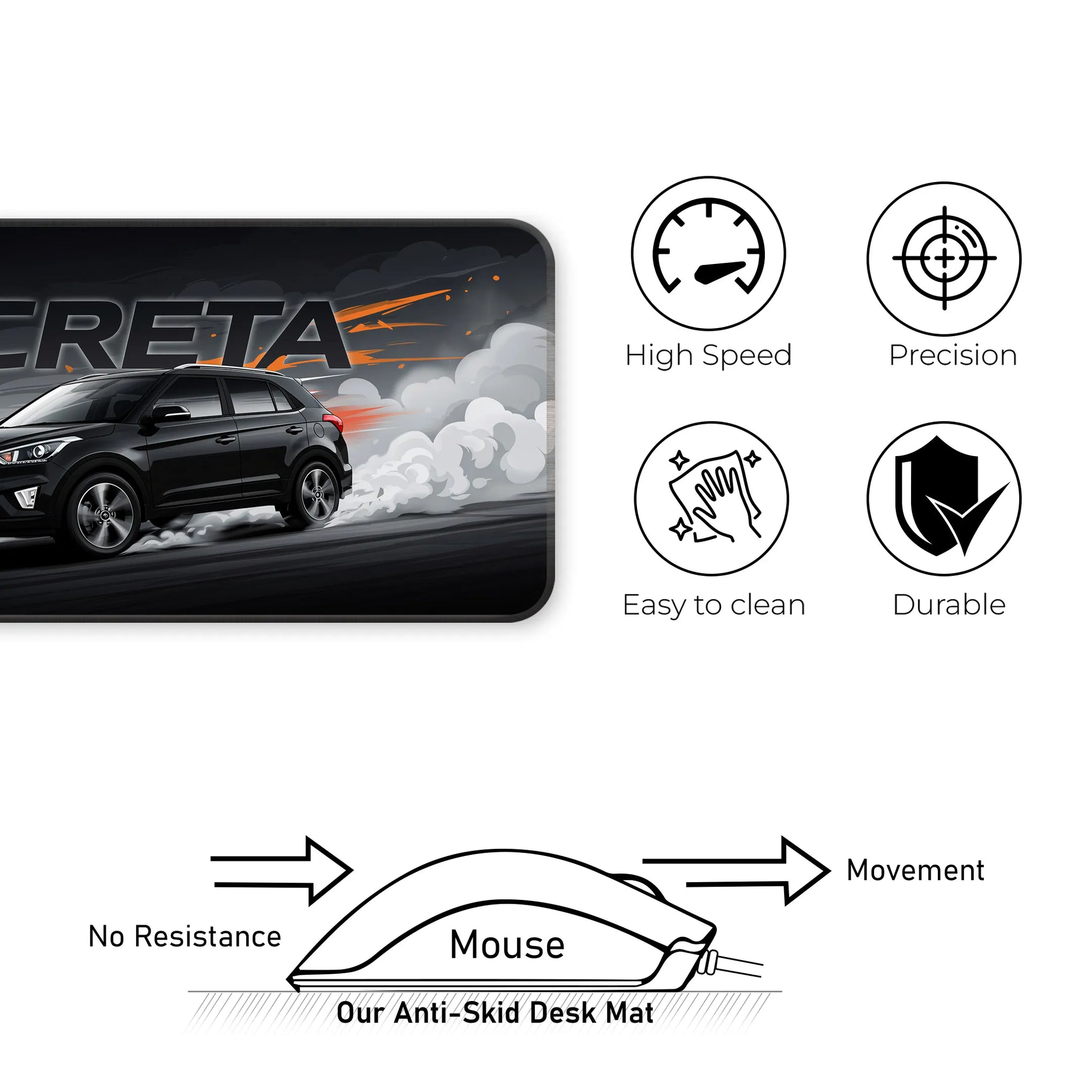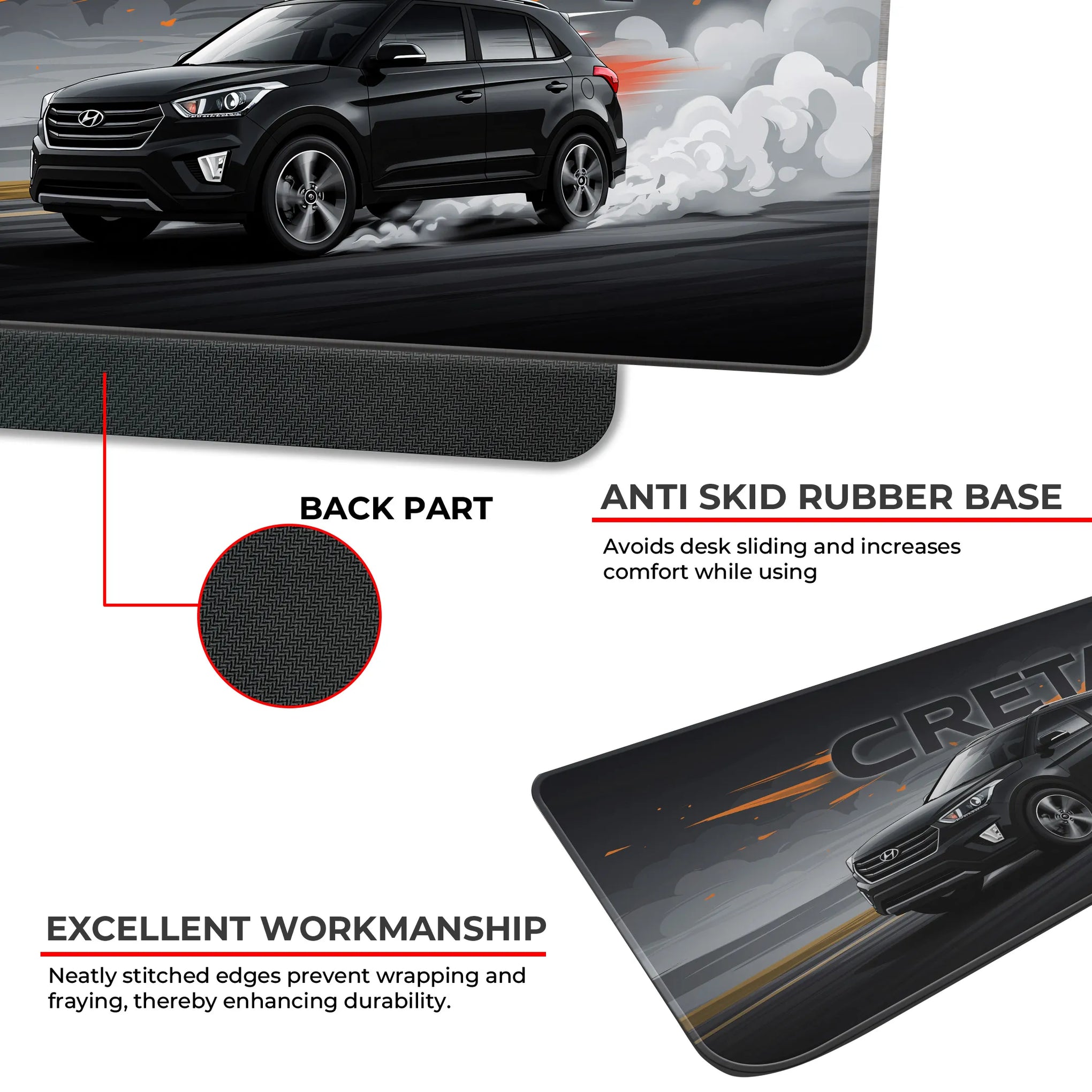 Showcase the elegance of the Hyundai Creta with this stylish deskmat. The black SUV against a bold grey racing background captures both speed and sophistication. With premium stitched edges, anti-slip rubber, and a smooth glide surface, it’s perfect for gamers, professionals, and Creta lovers.