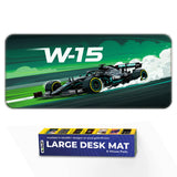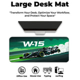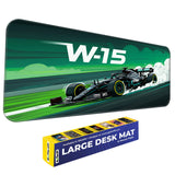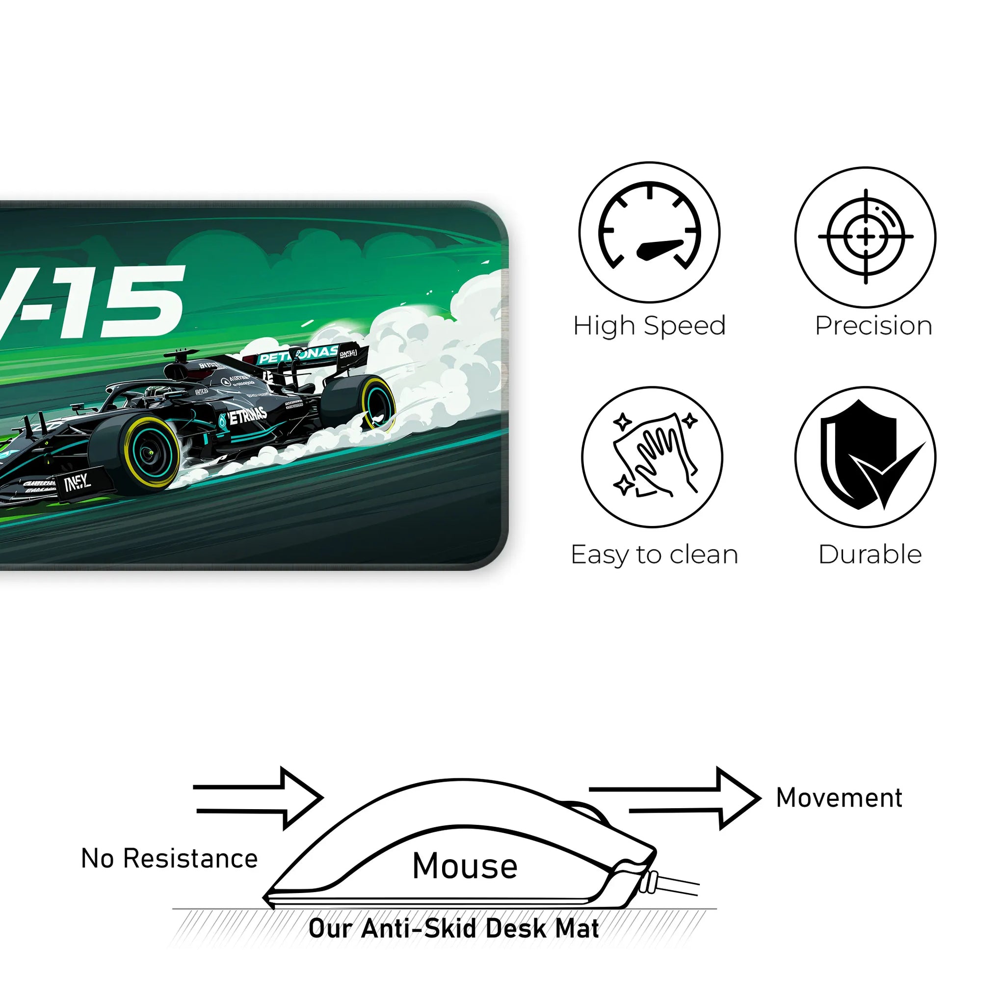 Bring Formula 1 adrenaline to your desk with this Mercedes W15 deskmat. Featuring the iconic black and green livery in a drift action scene, this oversized deskmat offers full coverage for your keyboard, mouse, and accessories. With a smooth precision surface and non-slip base, it’s perfect for gamers, racing fans, and collectors of F1 gear.