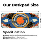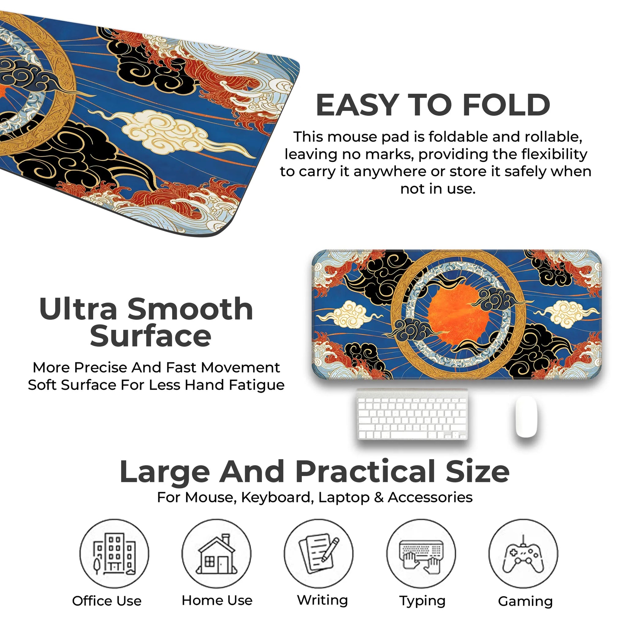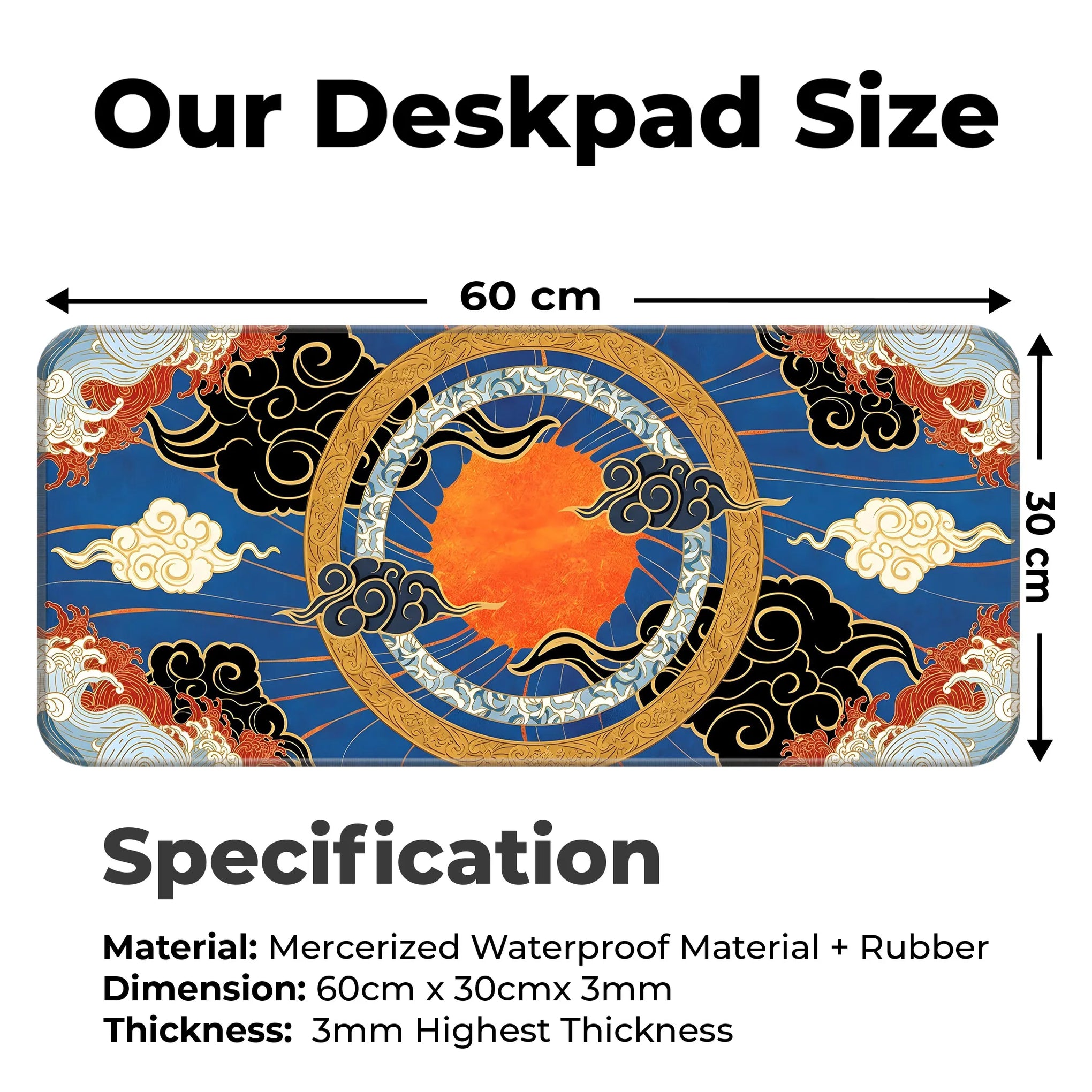 Bring timeless elegance to your workspace with this Oriental Sun & Cloud deskmat. Inspired by traditional Asian motifs, it features a radiant sun surrounded by ornate clouds and waves in bold blue, orange, and gold hues. Perfect for art lovers, collectors, and those who want cultural richness at their desk. Built with a smooth fabric surface for precision and an anti-slip rubber base for stability.