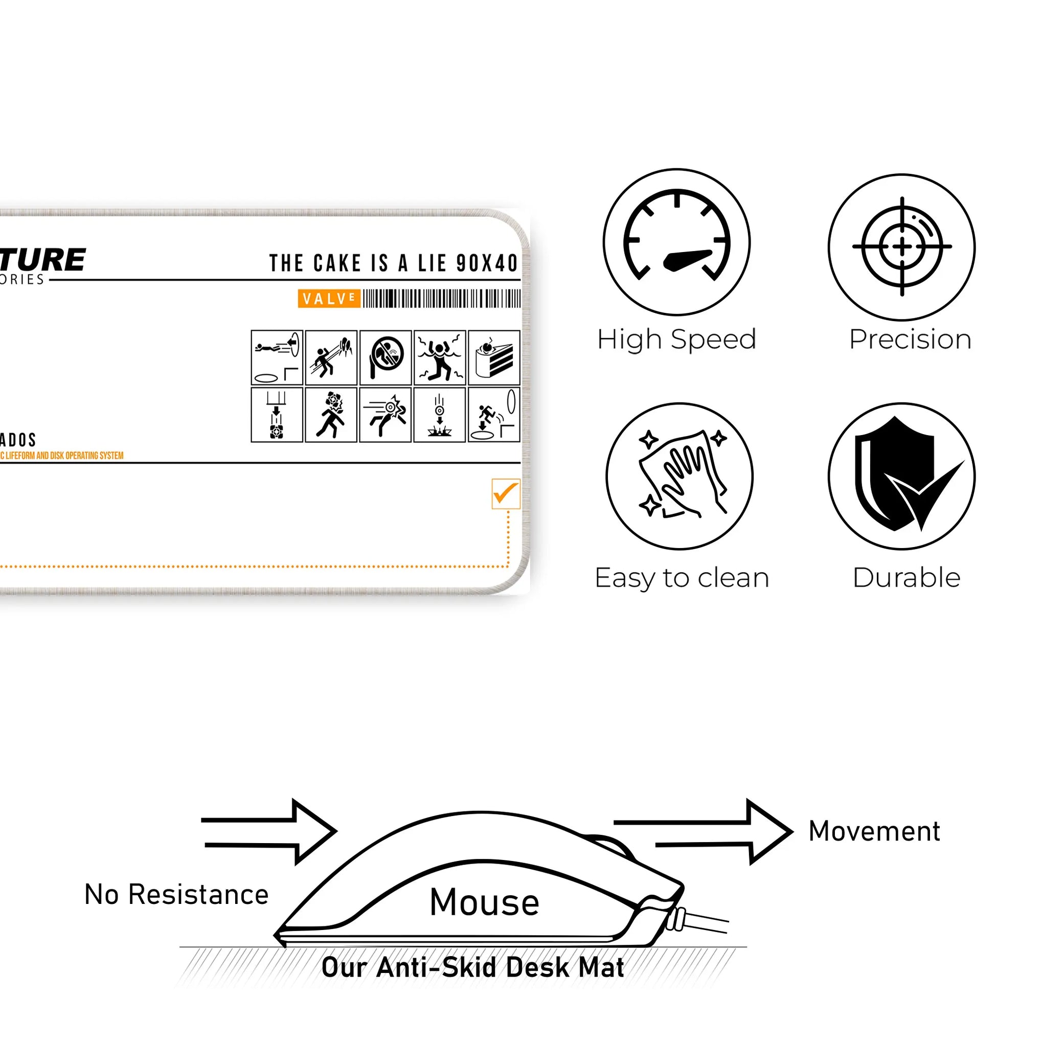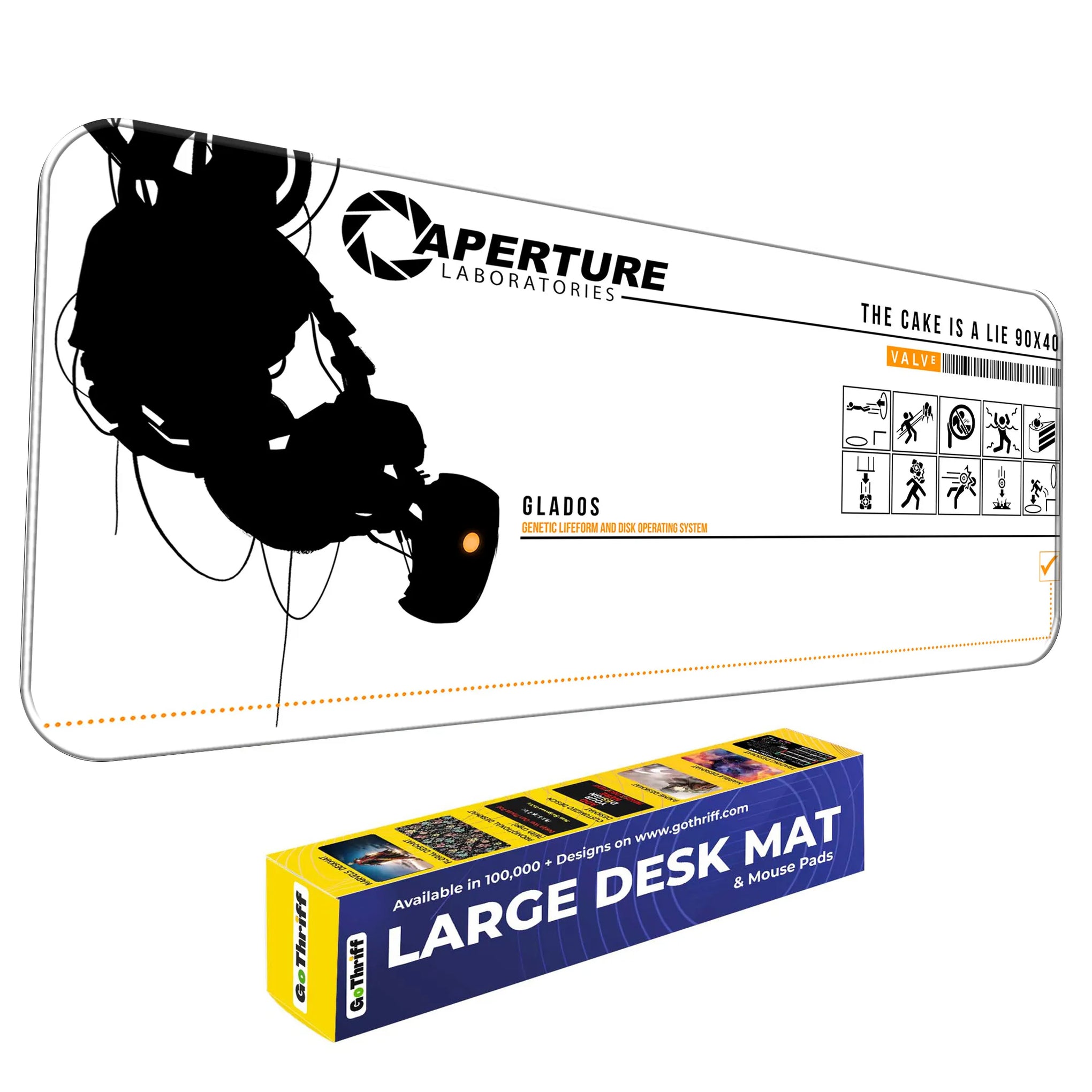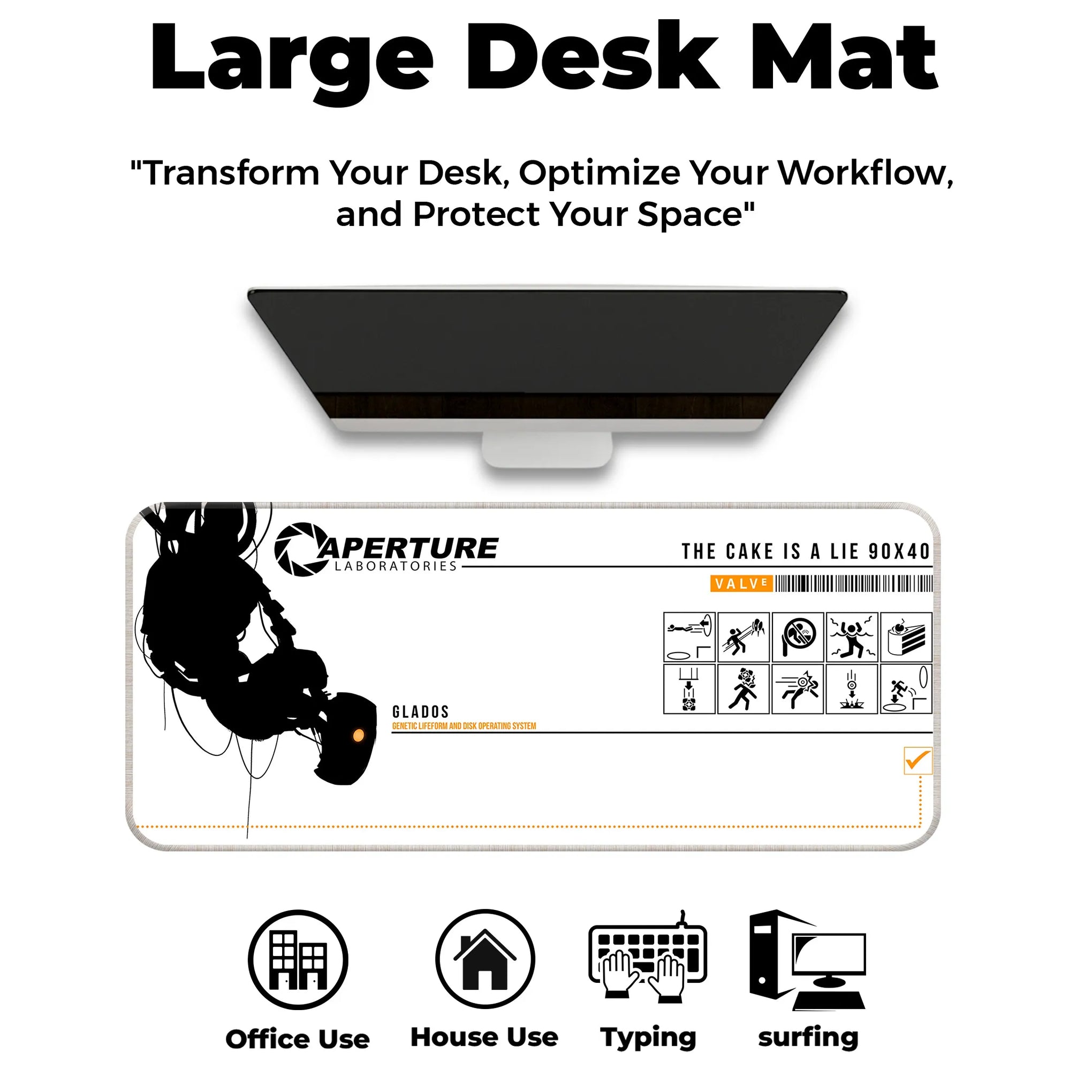 Enter Aperture Labs with this clean white desk mat featuring GLaDOS, iconic warning signs, and the famous line “The cake is a lie.” A must-have for Valve and Portal fans.