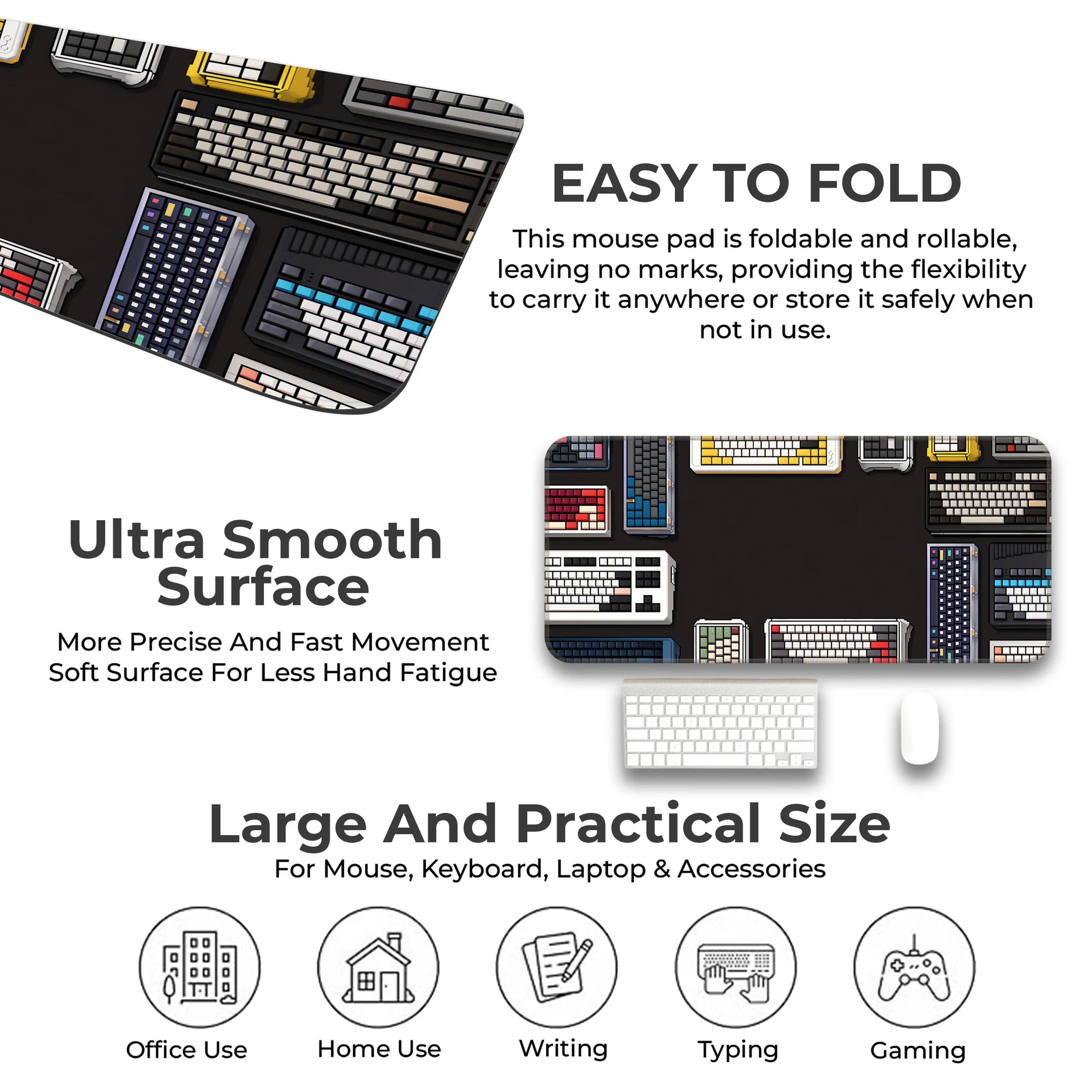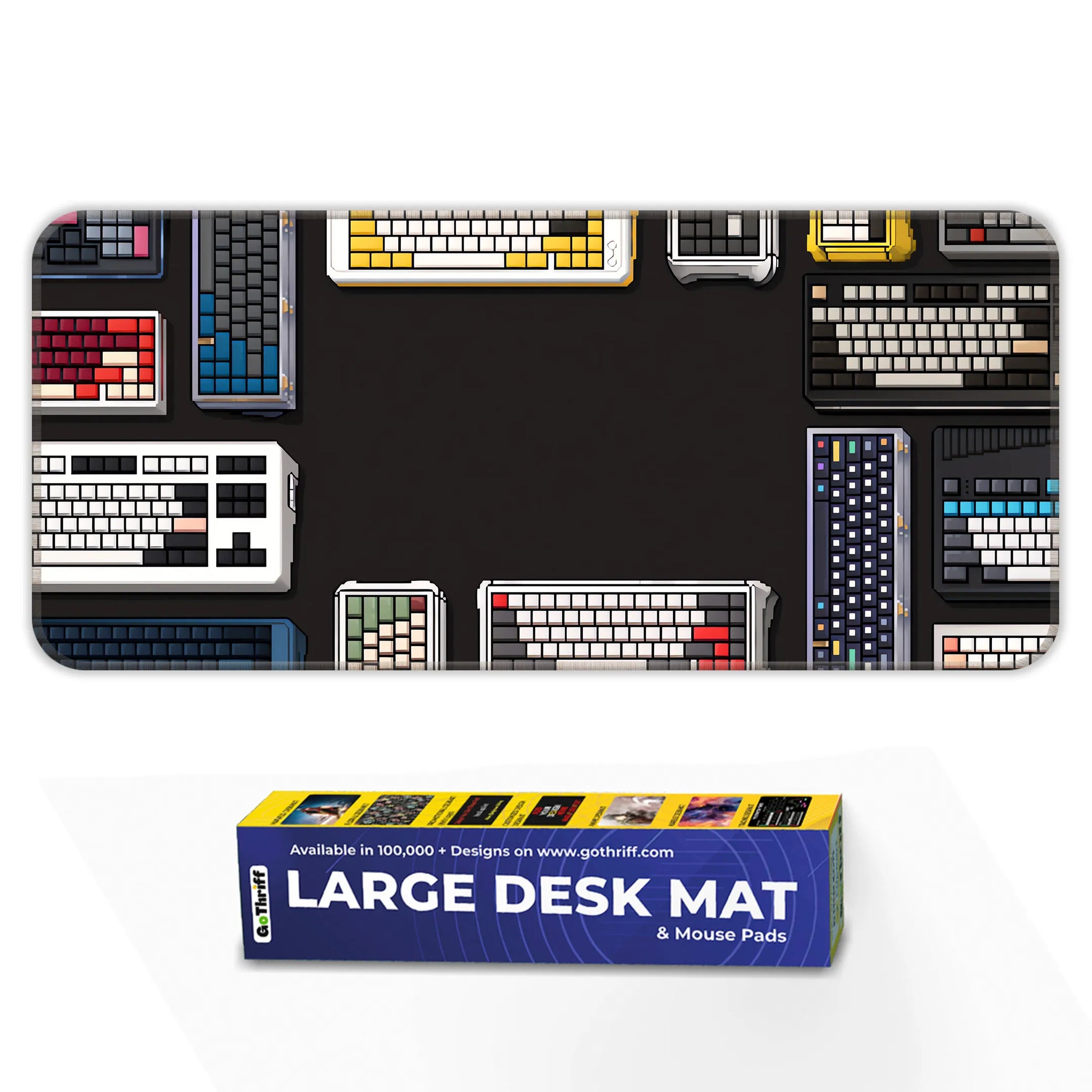 Showcase your love for mechanical keyboards with this stylish deskmat featuring a variety of colorful keyboard layouts surrounding a dark central space. The sleek design offers a perfect surface for gaming, typing, or working while bringing personality to your setup. Its anti-slip rubber base ensures grip, and the smooth fabric guarantees comfort and precision for daily use. Ideal for keyboard enthusiasts, gamers, and collectors.