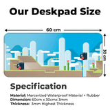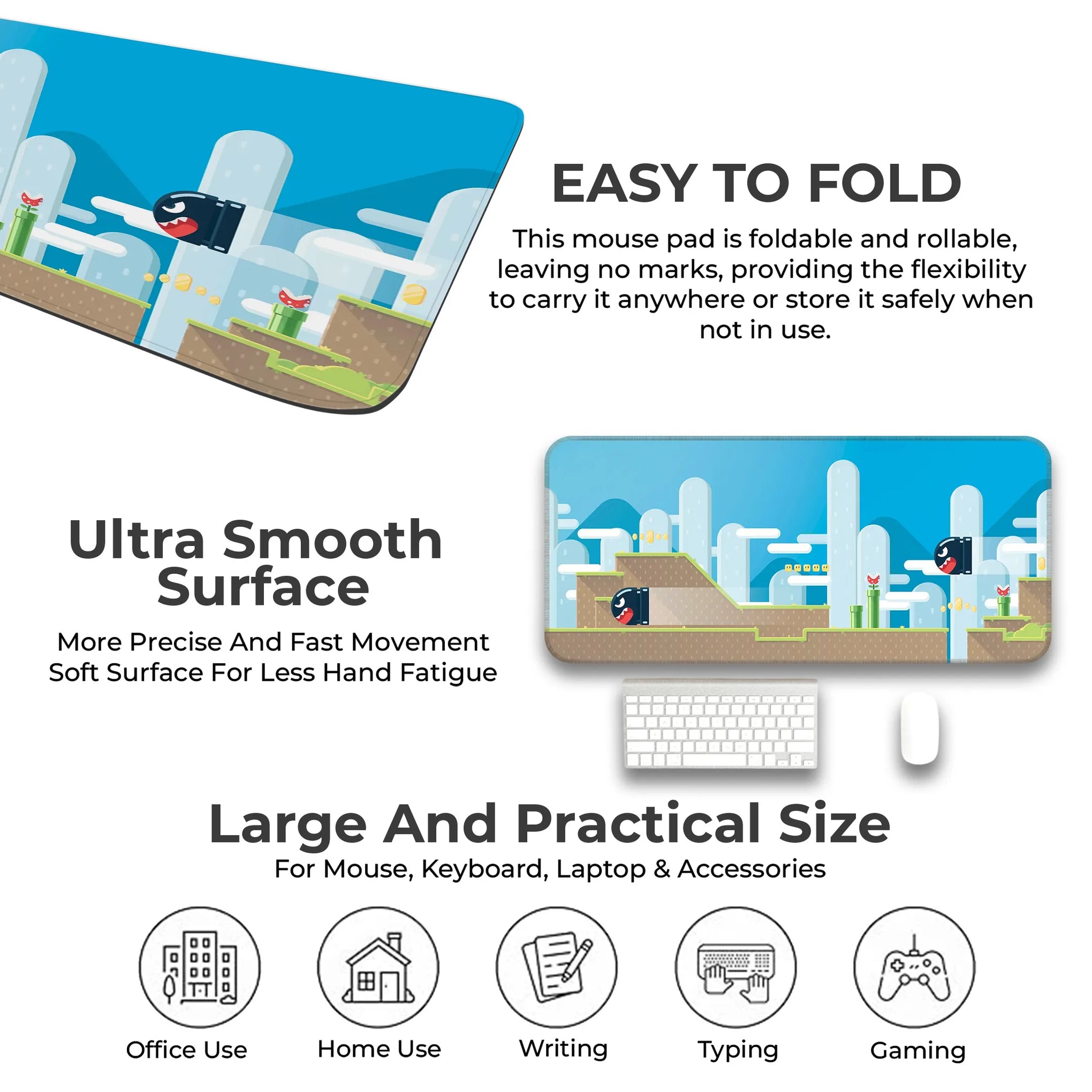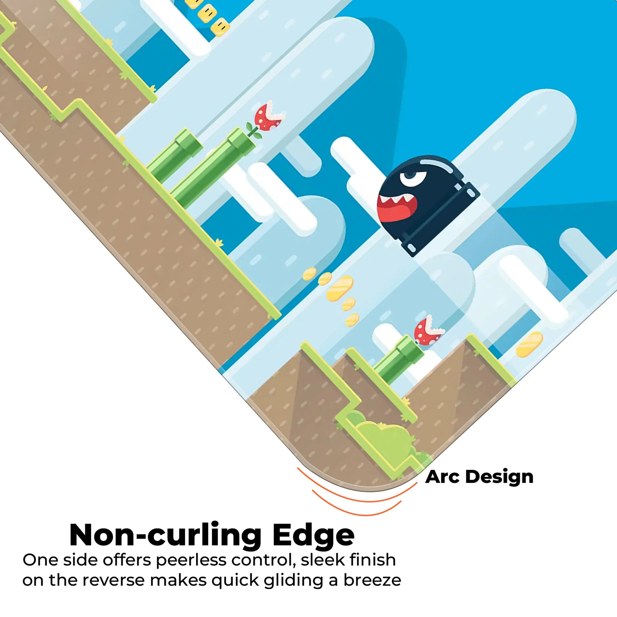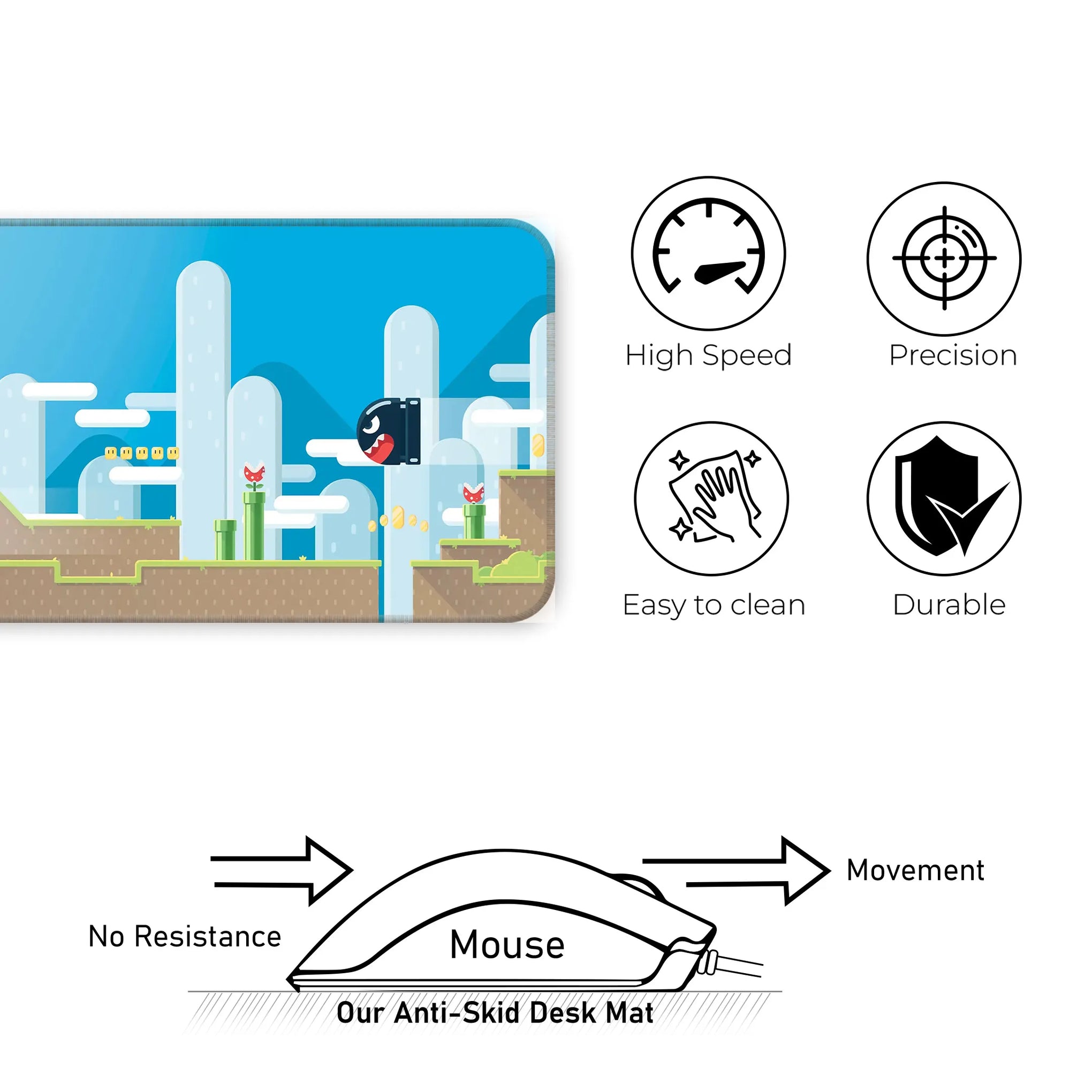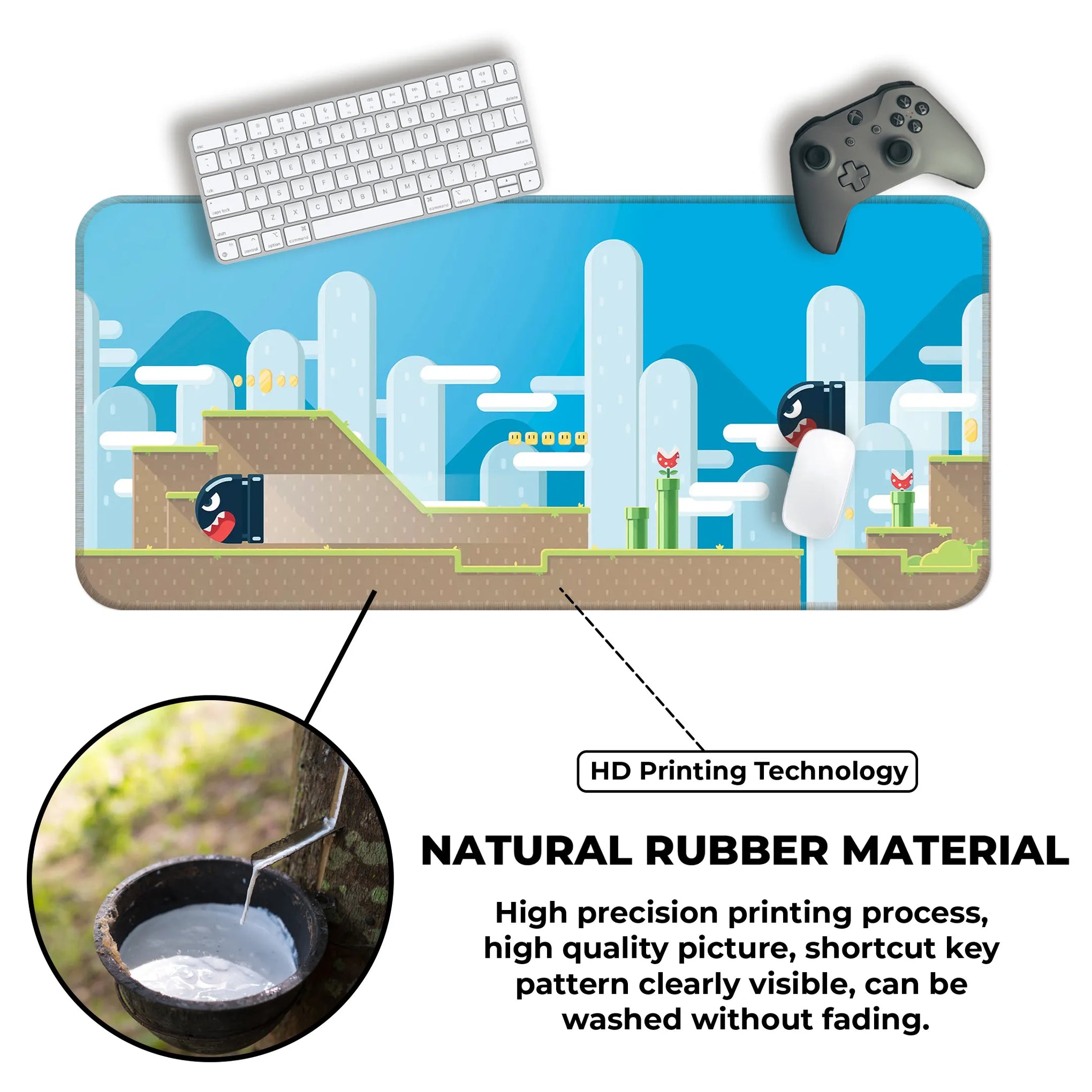 Jump into nostalgia with this colorful desk mat inspired by classic platformer games. Perfect for retro gamers and pixel art lovers who grew up collecting coins and dodging bullets.
