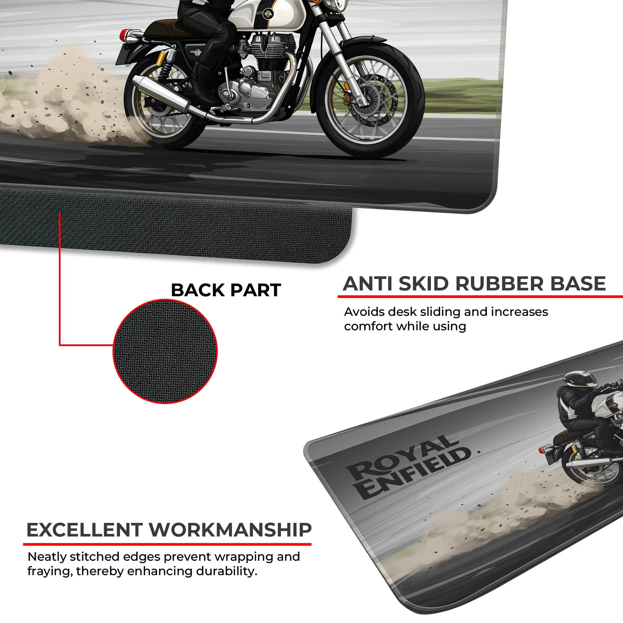 Celebrate heritage riding with this Royal Enfield deskmat featuring the iconic Classic model in white and black. Designed for bikers and desk setup lovers, it offers a smooth glide surface, stitched durability, and a non-slip base. The timeless Royal Enfield design makes it a premium desk accessory for collectors and fans.