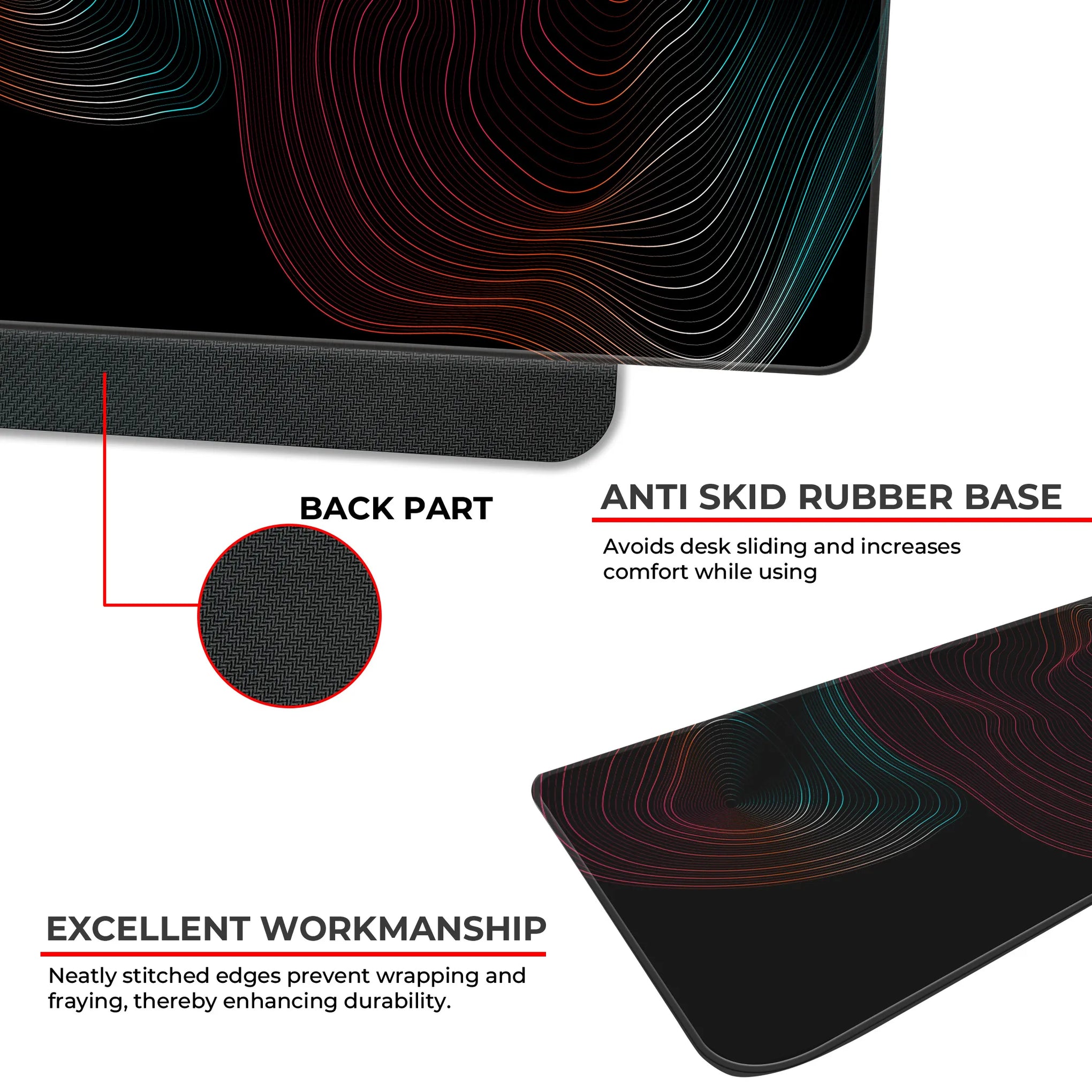 Transform your workspace into a dynamic art piece with this vibrant neon contour line deskmat. Featuring flowing lines in shades of red, orange, teal, and pink, this design radiates energy and creativity. Perfect for gamers, streamers, and artists, the mat not only enhances aesthetics but also delivers top performance. The oversized build provides a protective layer for your desk, while the silky surface ensures effortless glide. Built to last with stitched edges and a durable anti-slip base.