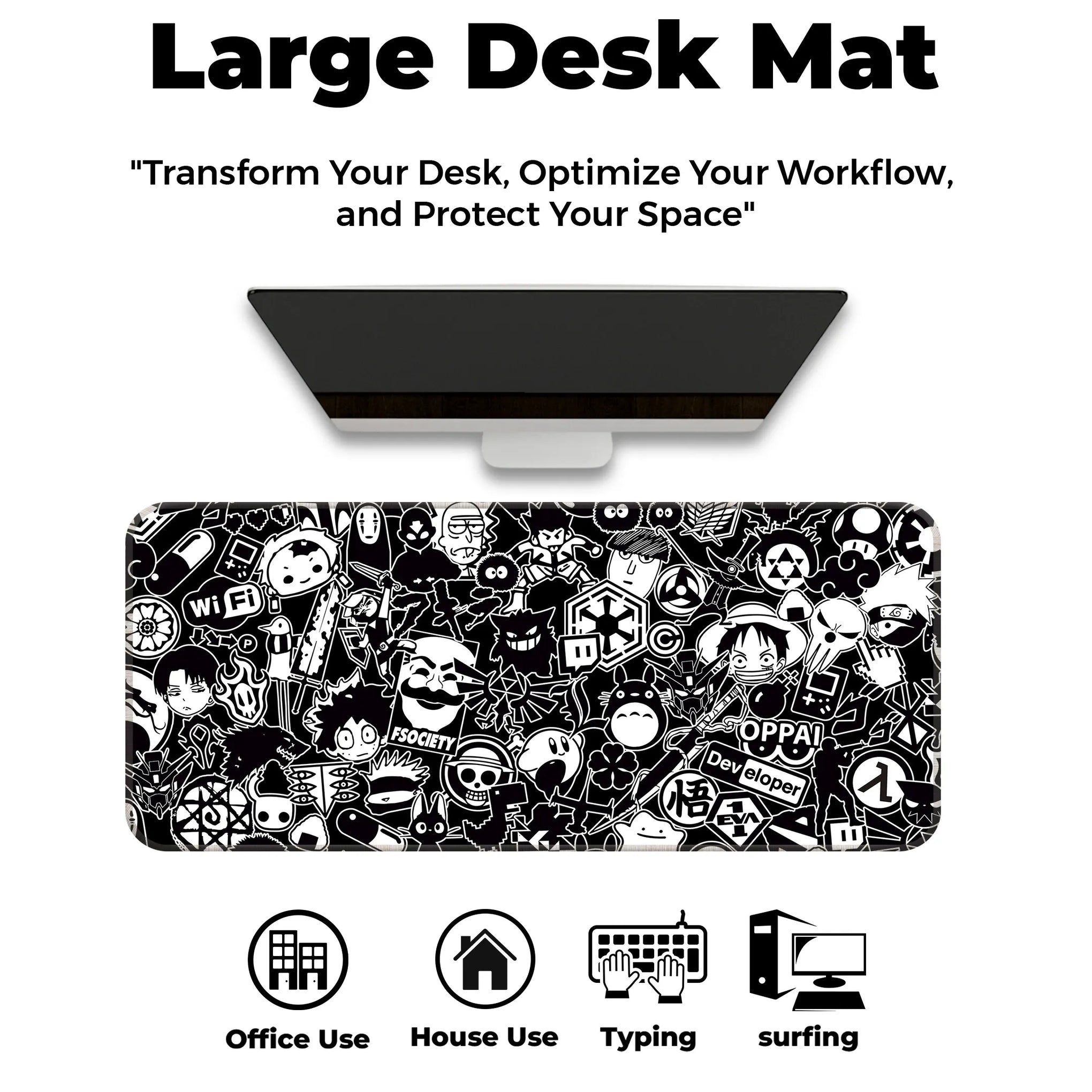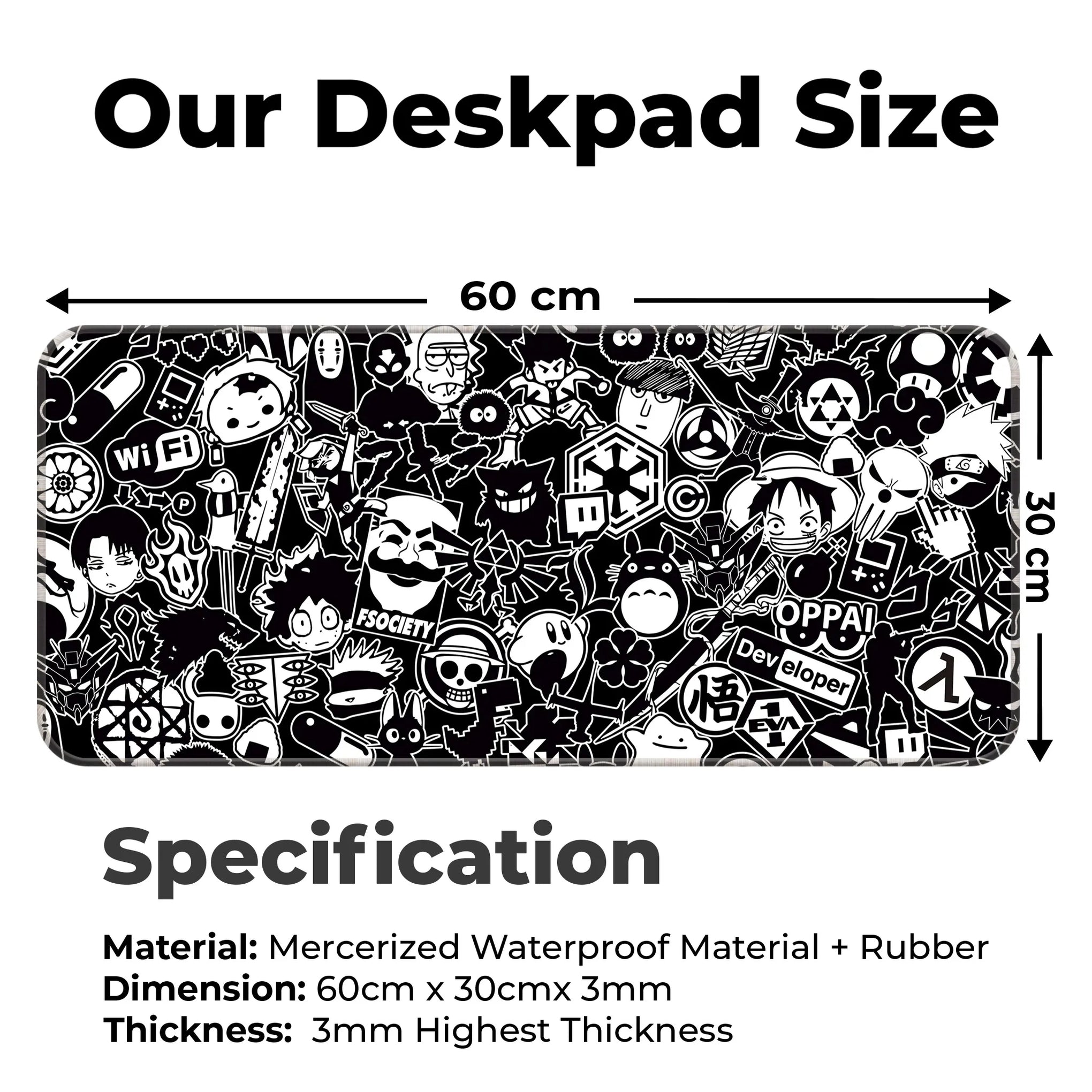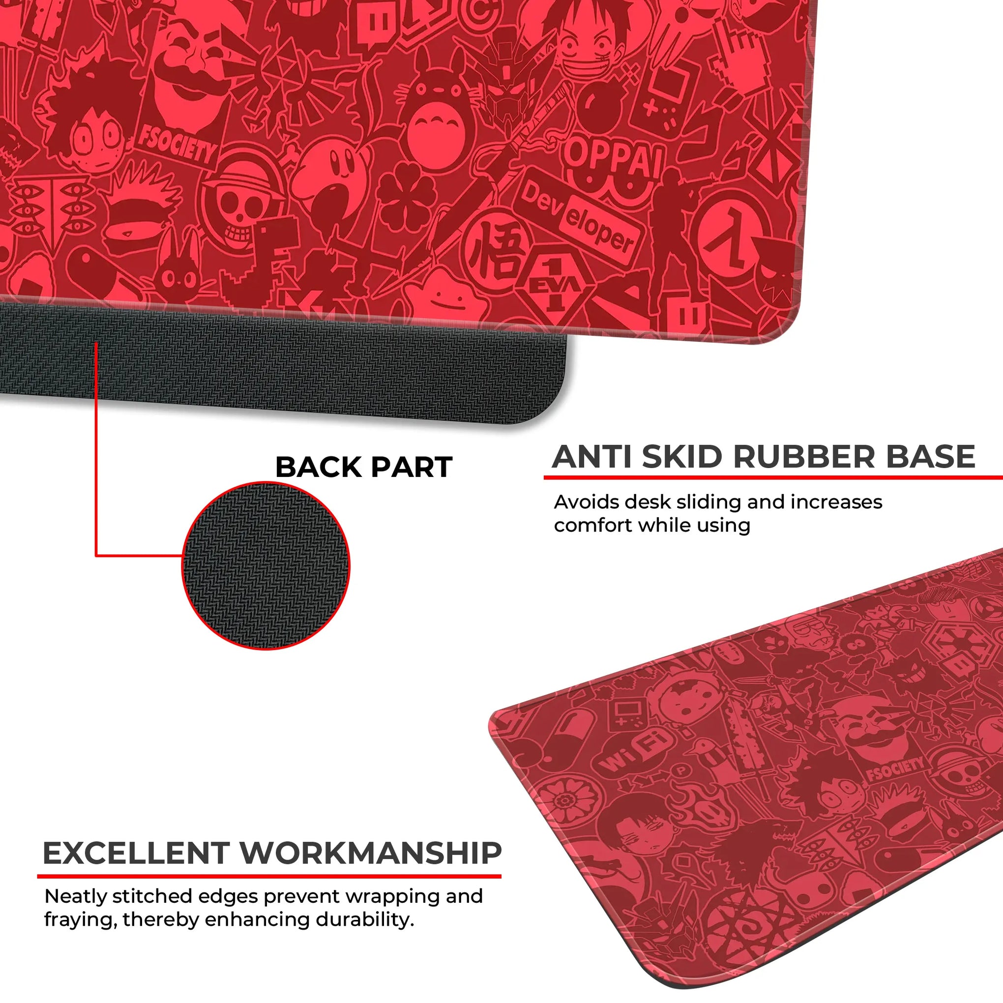 Perfect for anime lovers, programmers, gamers, and otakus, this mat speaks your language with symbols like Wi-Fi icons, hacker masks, gameboys, dev tools, and OPPAI signs, all in sleek monochrome red.