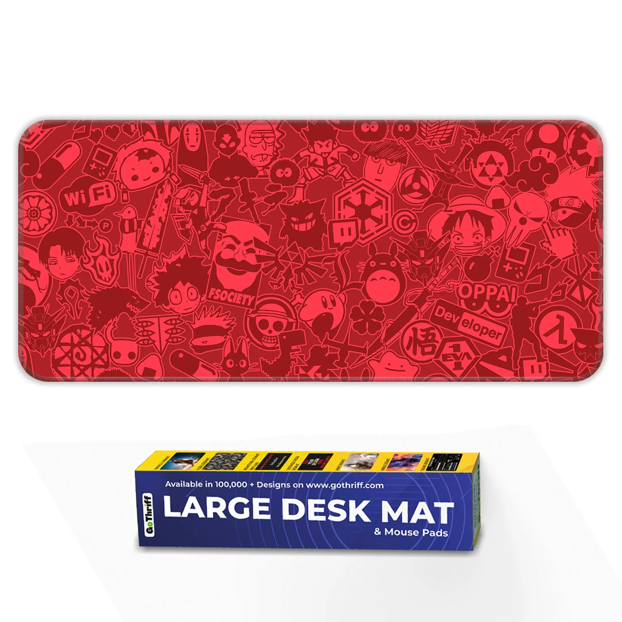 Level up your desk setup with the Anime Hacker Collage Desk Mat, a bold red canvas packed with iconic characters and symbols from anime, manga, gaming, and hacker culture. From Gengar to Totoro, Naruto to Luffy, this mat blends a clean line-art aesthetic with chaotic sticker-bomb energy.