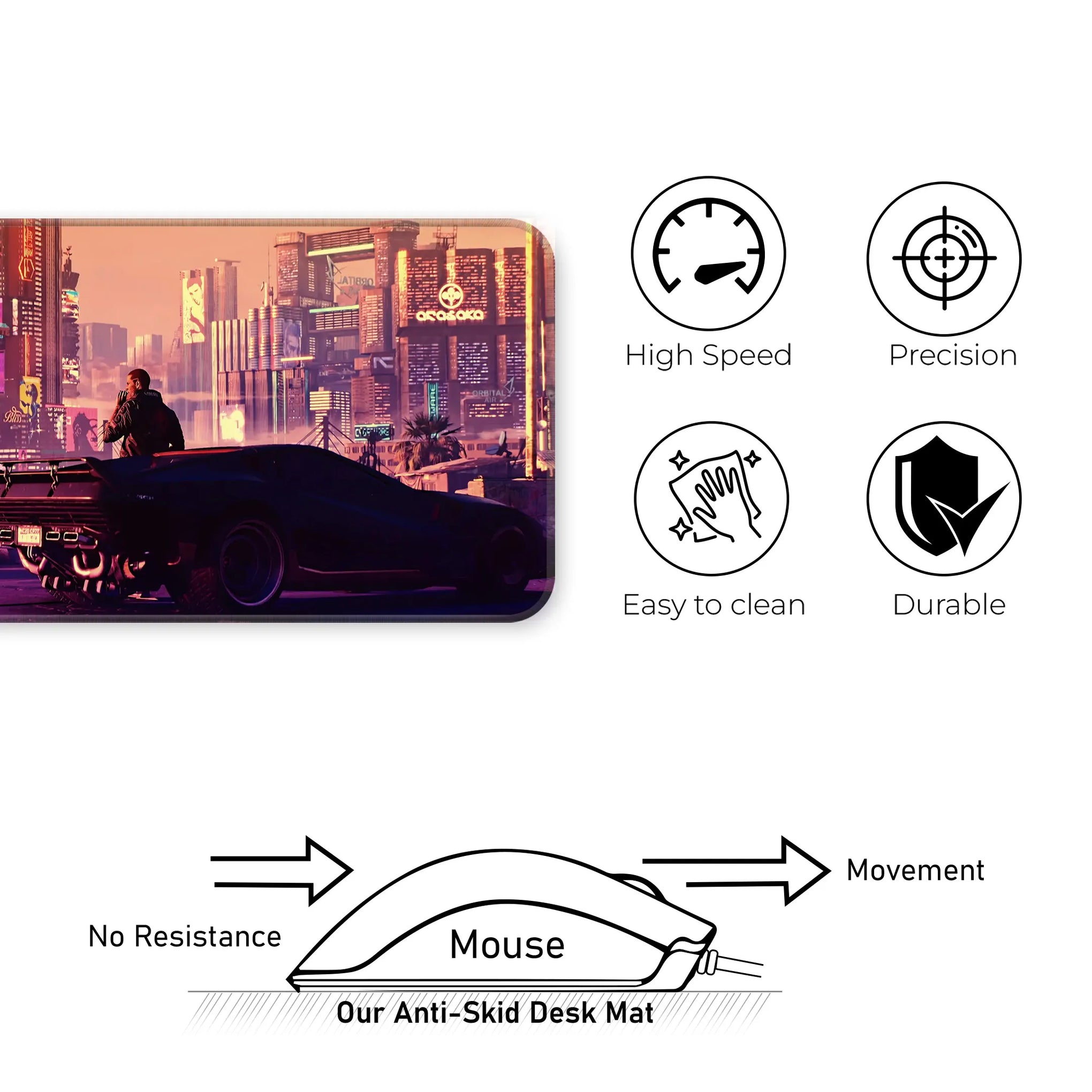Cruise into the neon-lit chaos of the future with this stunning Cyberpunk desk mat. Featuring towering city lights, retro cars, and gritty dystopian vibes—made for urban rebels and gamers.