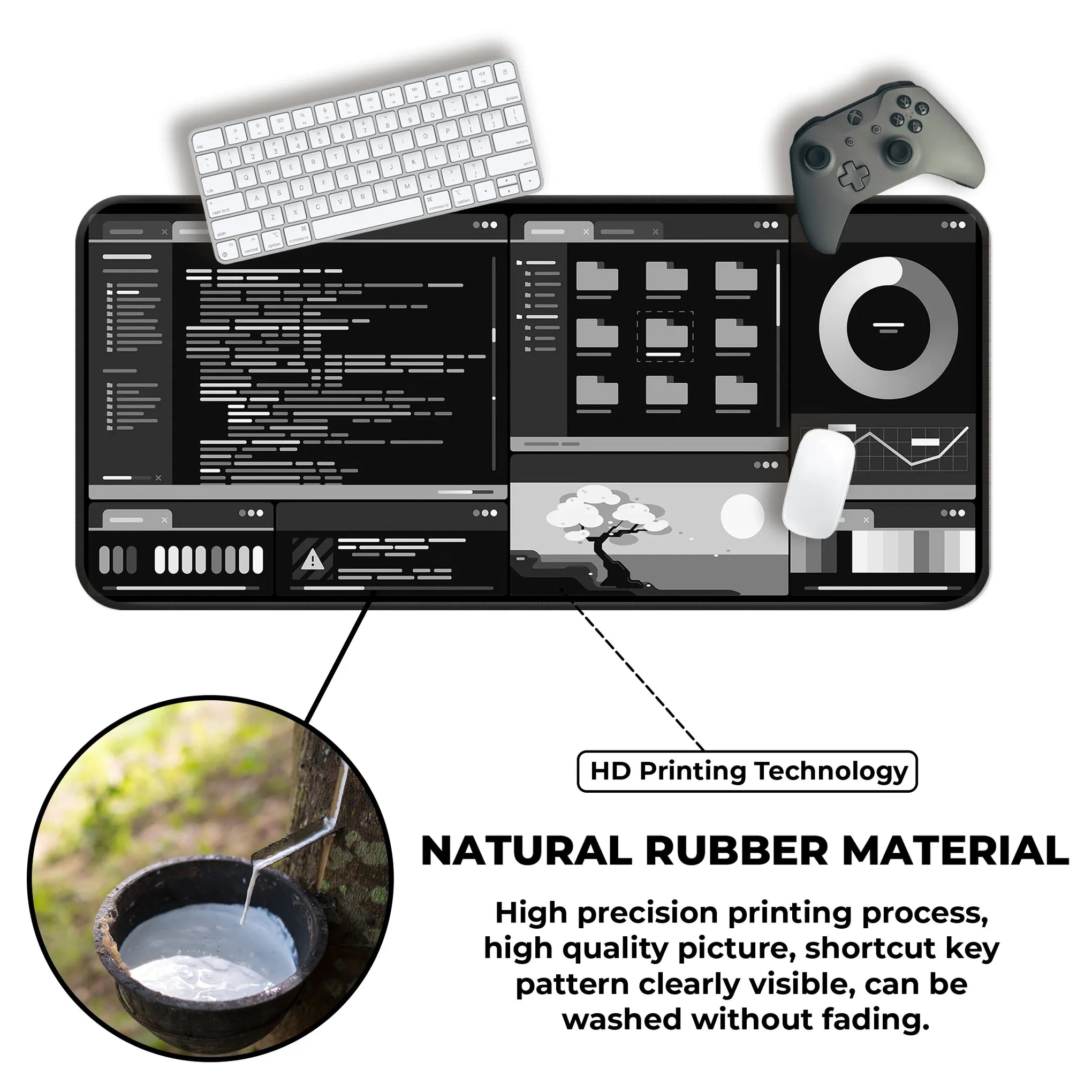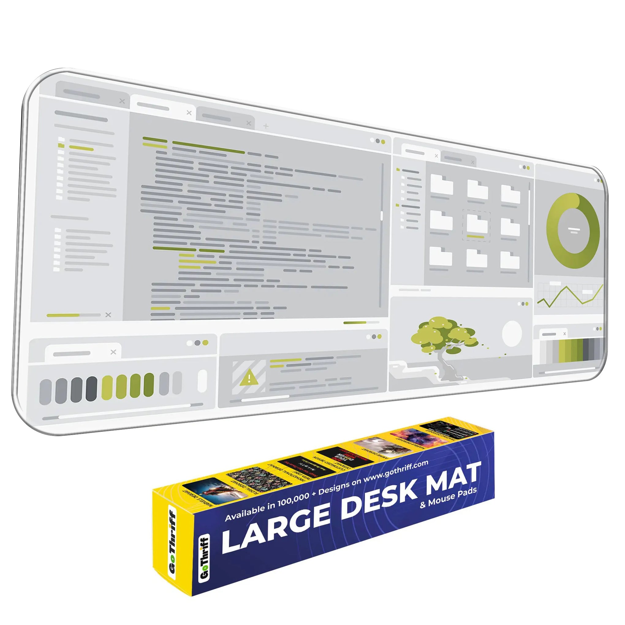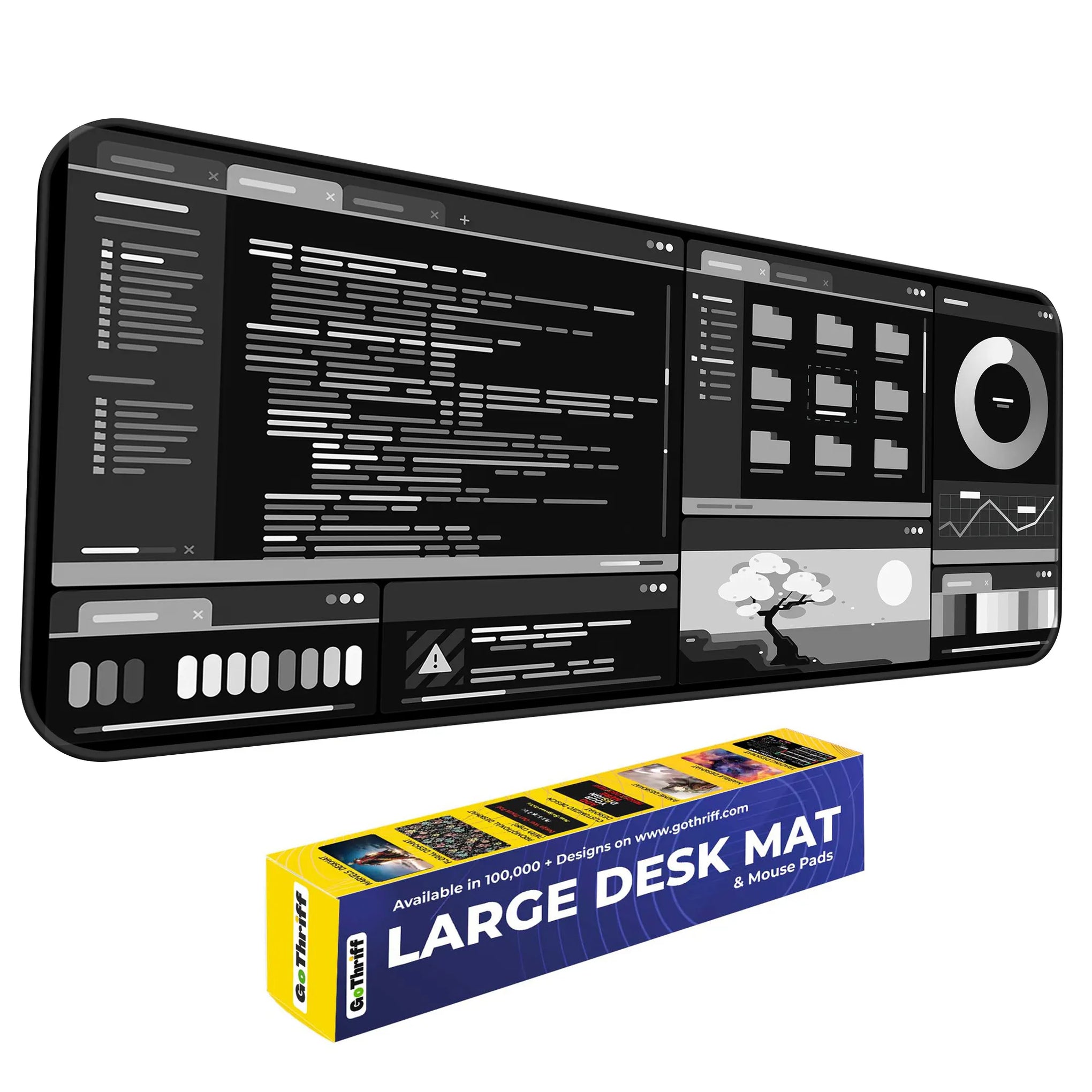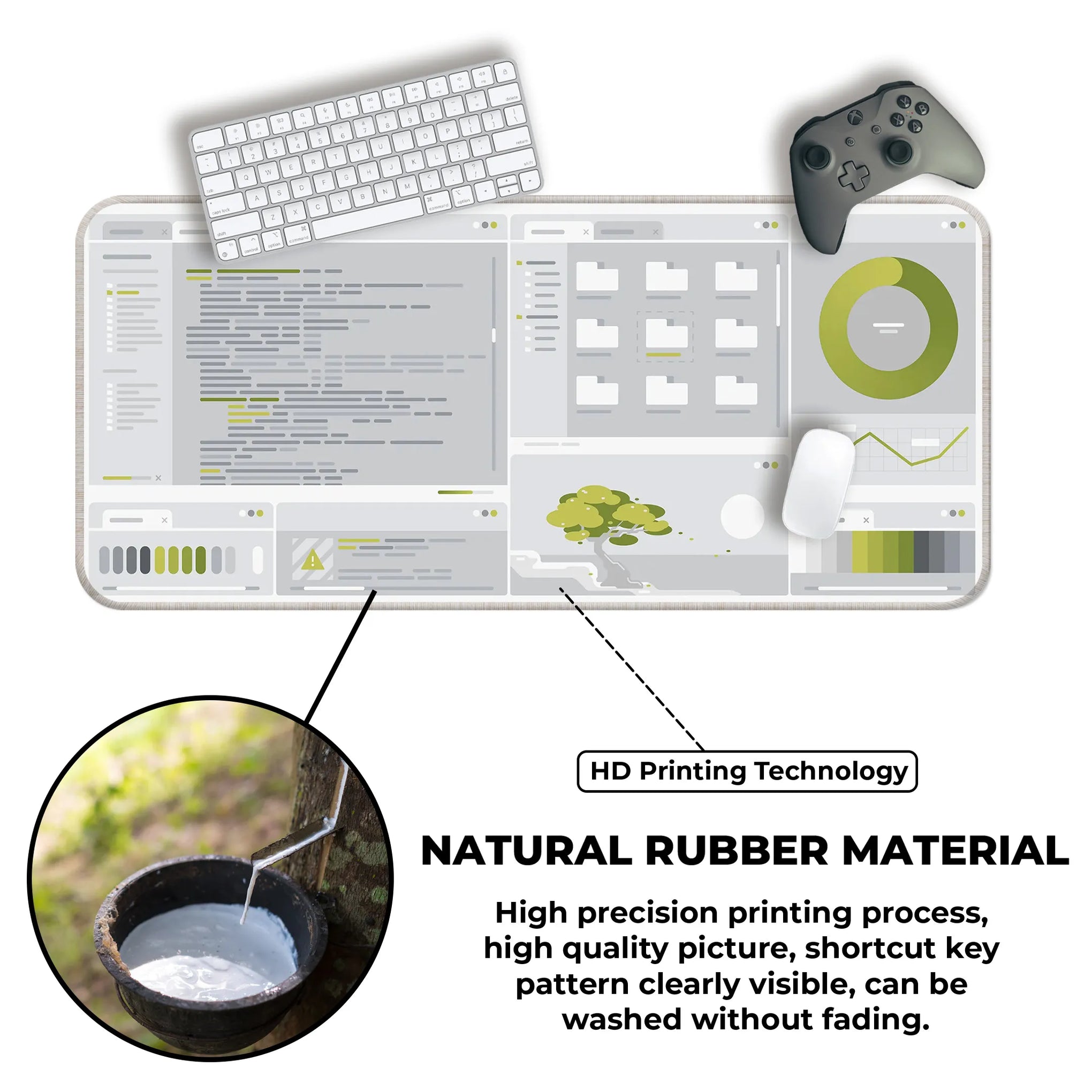 Bring peace to your programming sessions with the Dev Zen Desk Mat, where functionality meets aesthetic clarity. This desk mat mimics a developer's dashboard with open code editors, file explorers, data visualizations, and subtle UI highlights — all framed in a soothing grayscale-green palette. A lone bonsai in the corner adds a calming visual cue, blending tech with tranquility.