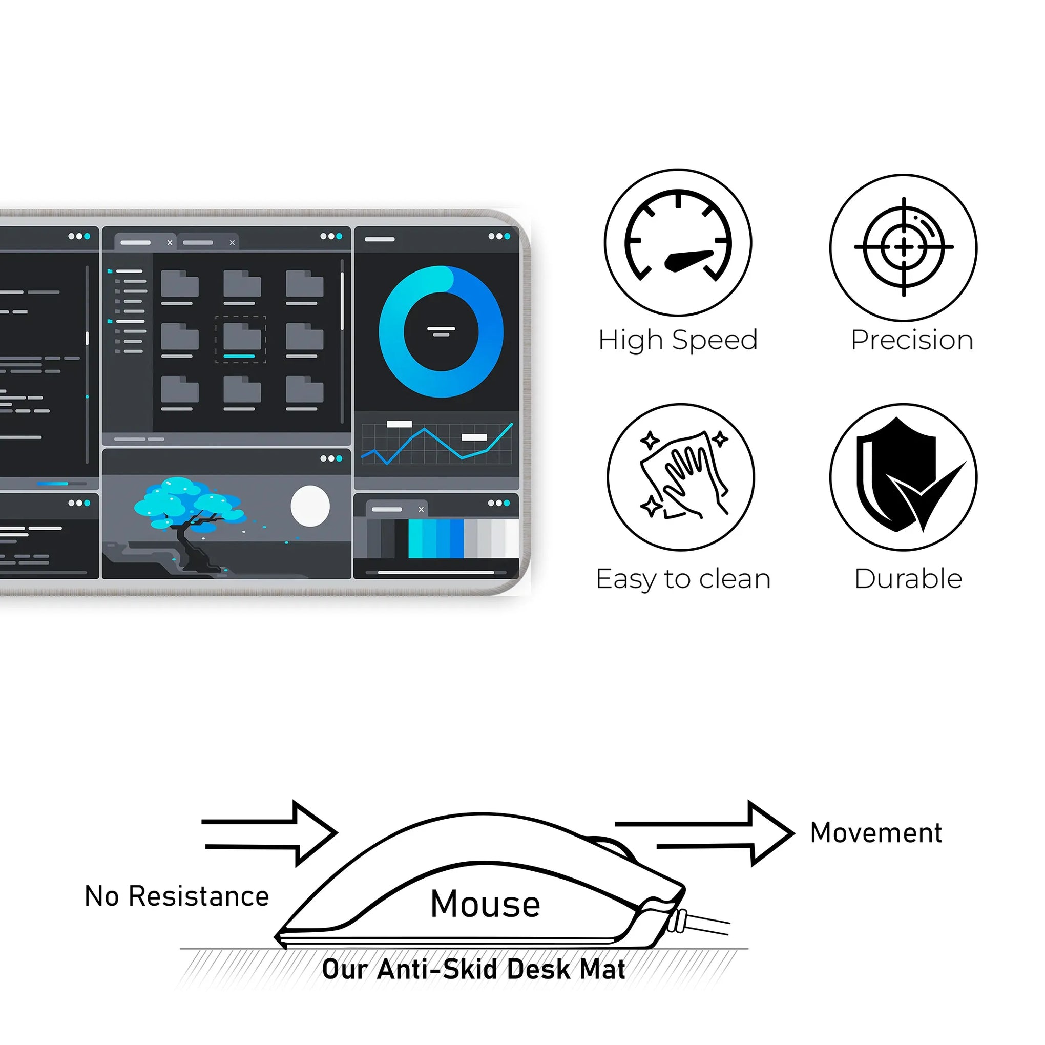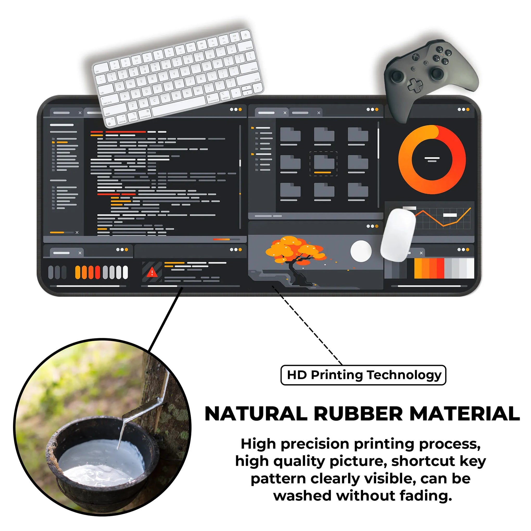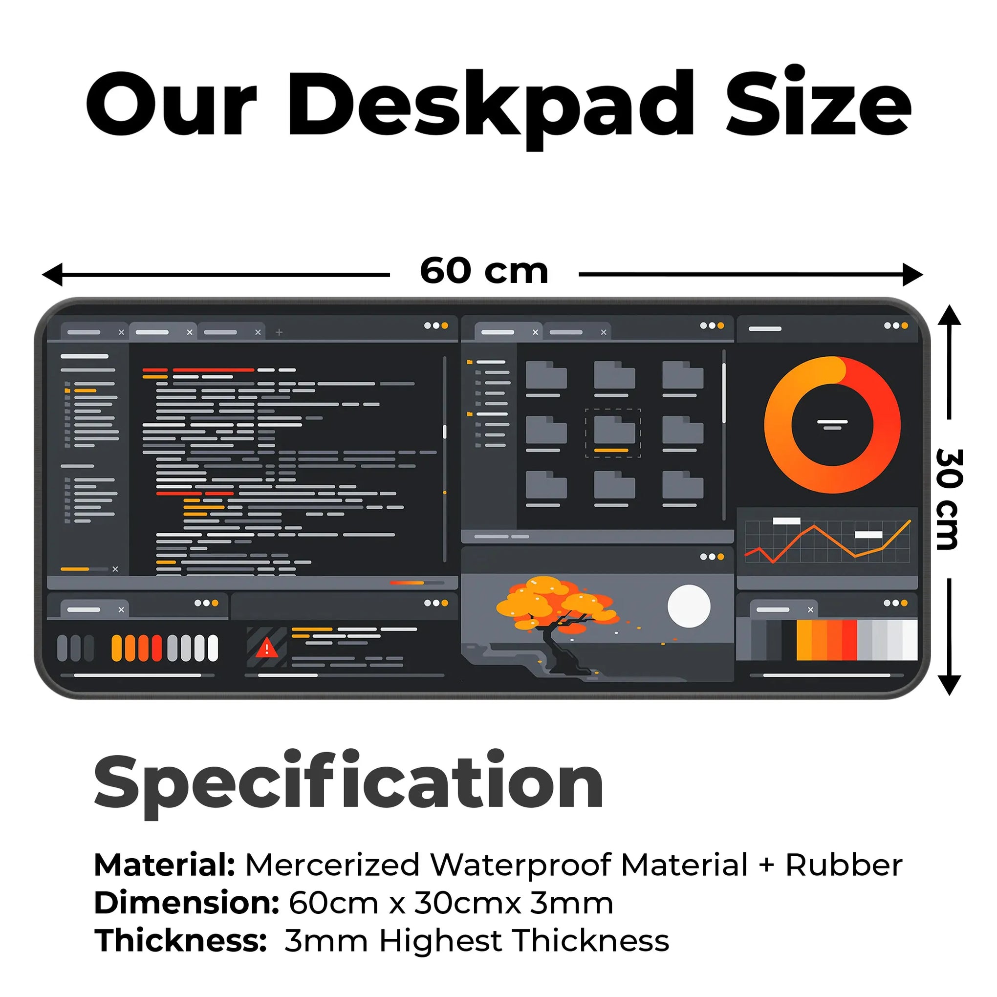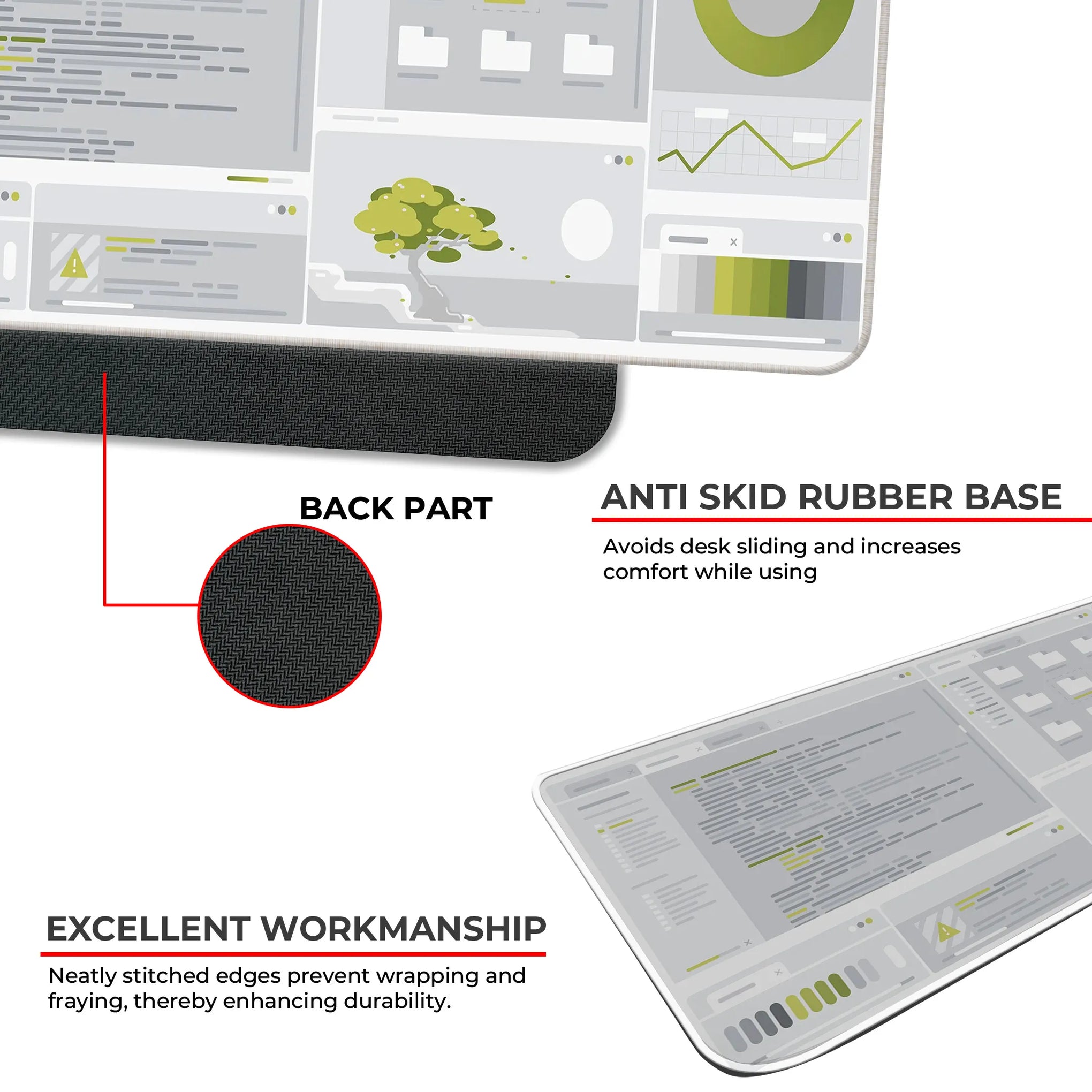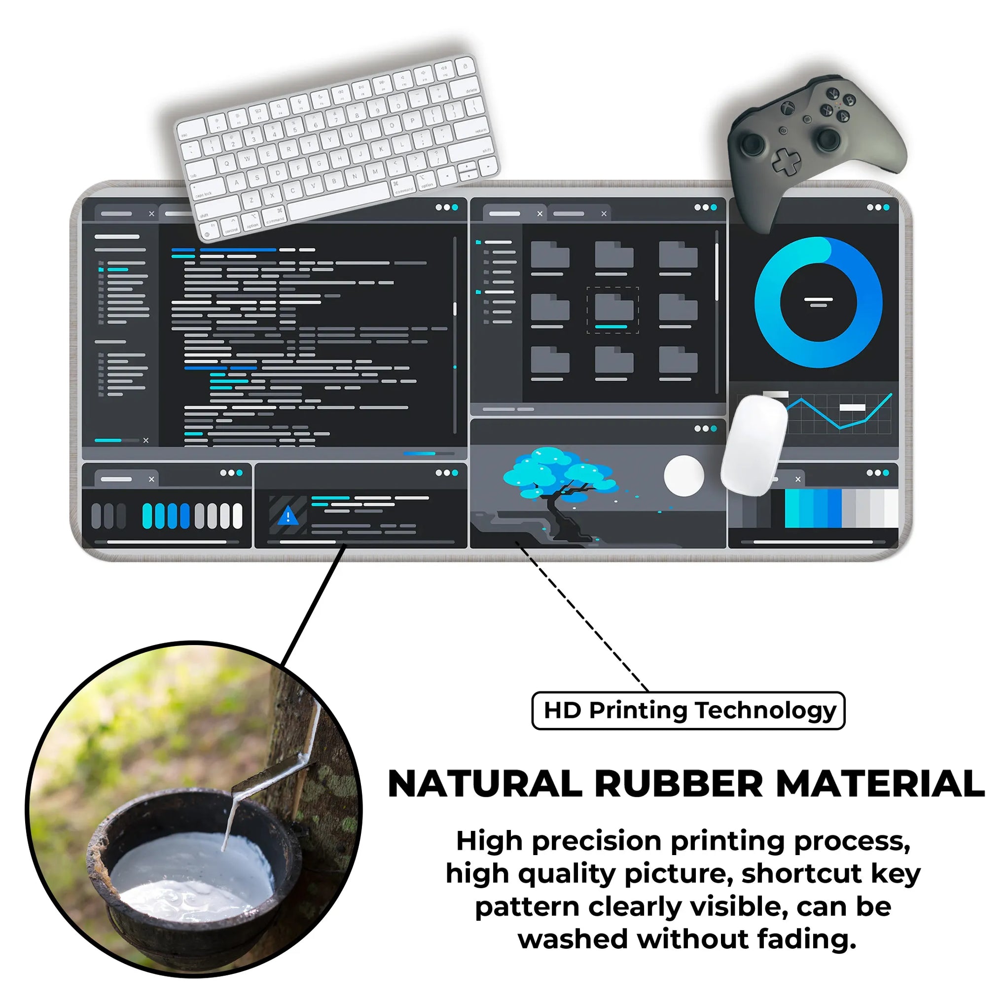 Bring peace to your programming sessions with the Dev Zen Desk Mat, where functionality meets aesthetic clarity. This desk mat mimics a developer's dashboard with open code editors, file explorers, data visualizations, and subtle UI highlights — all framed in a soothing grayscale-green palette. A lone bonsai in the corner adds a calming visual cue, blending tech with tranquility.