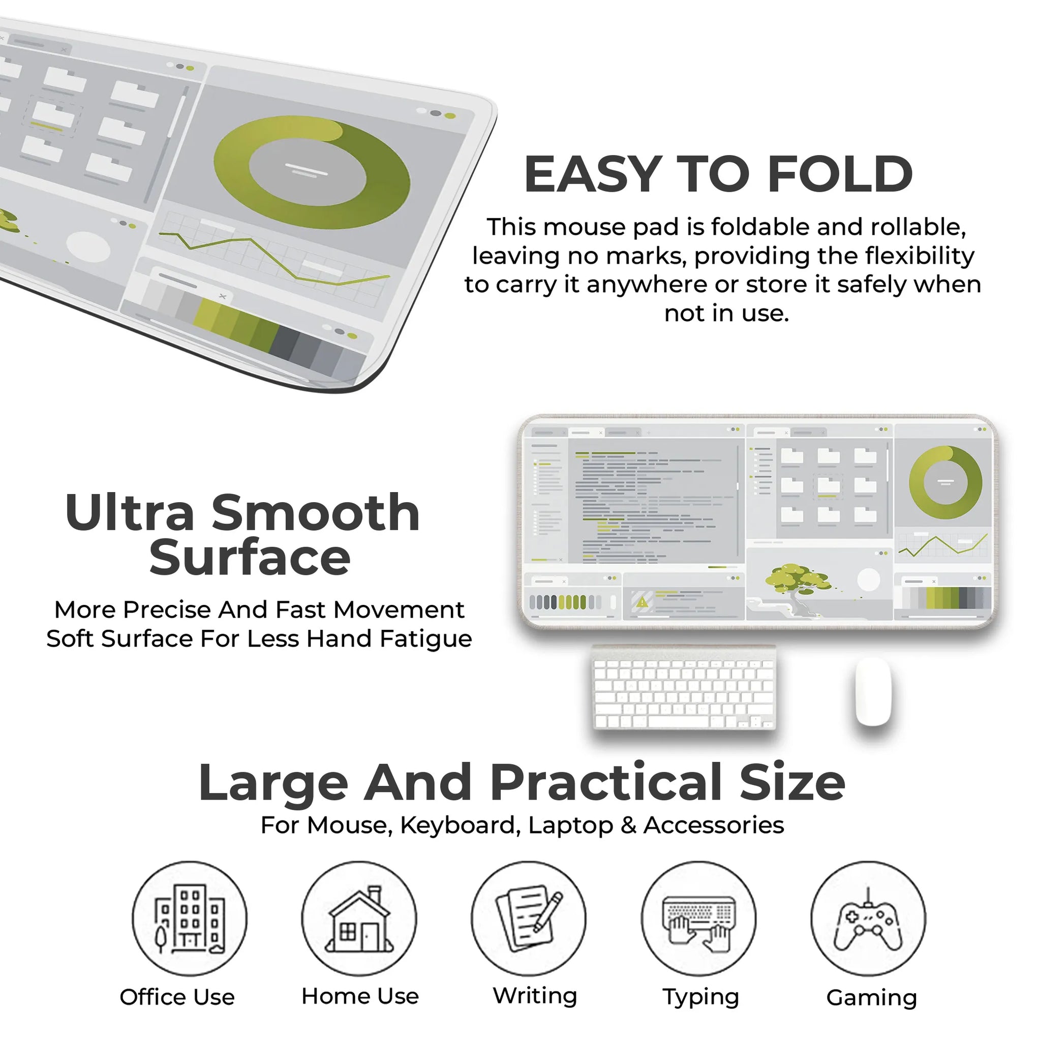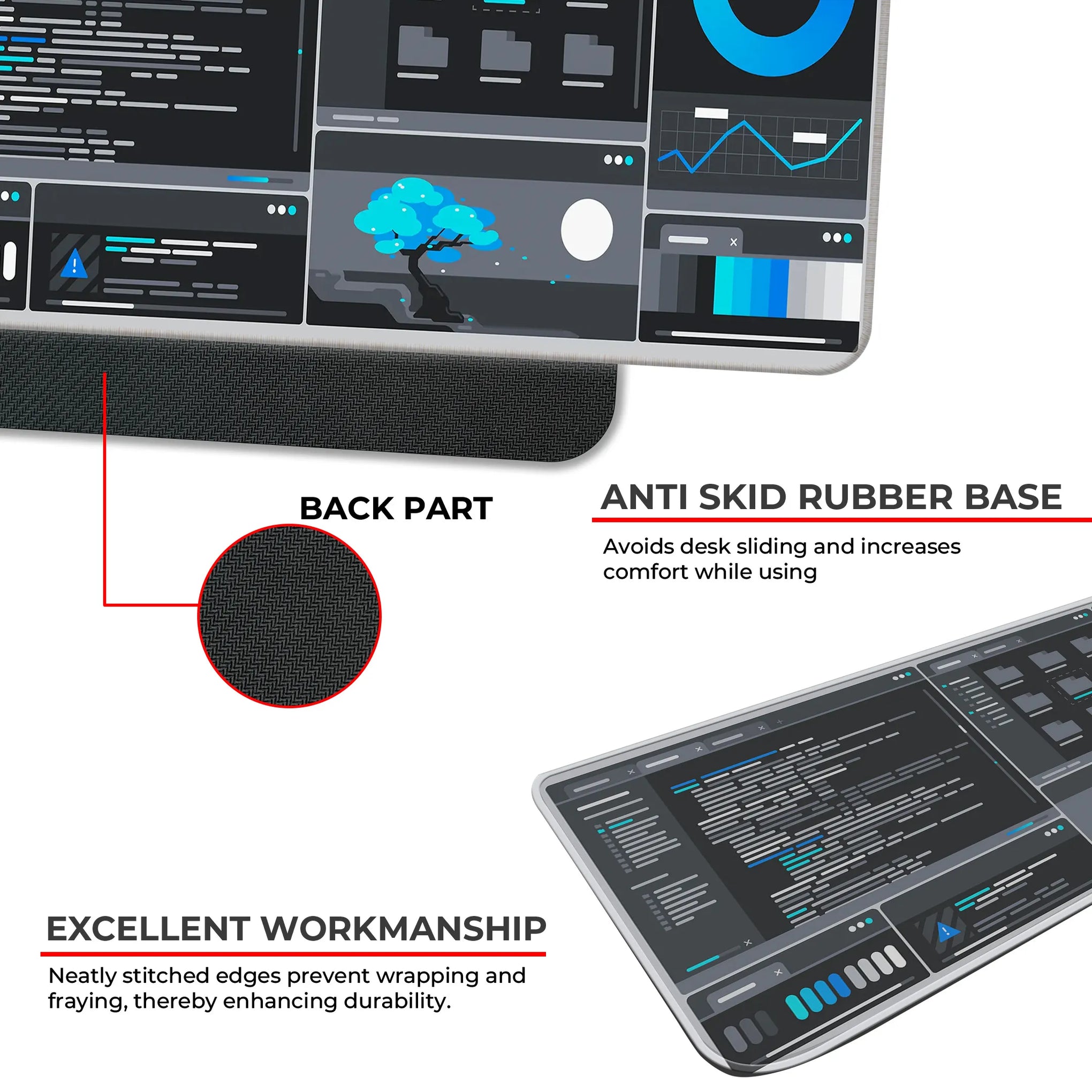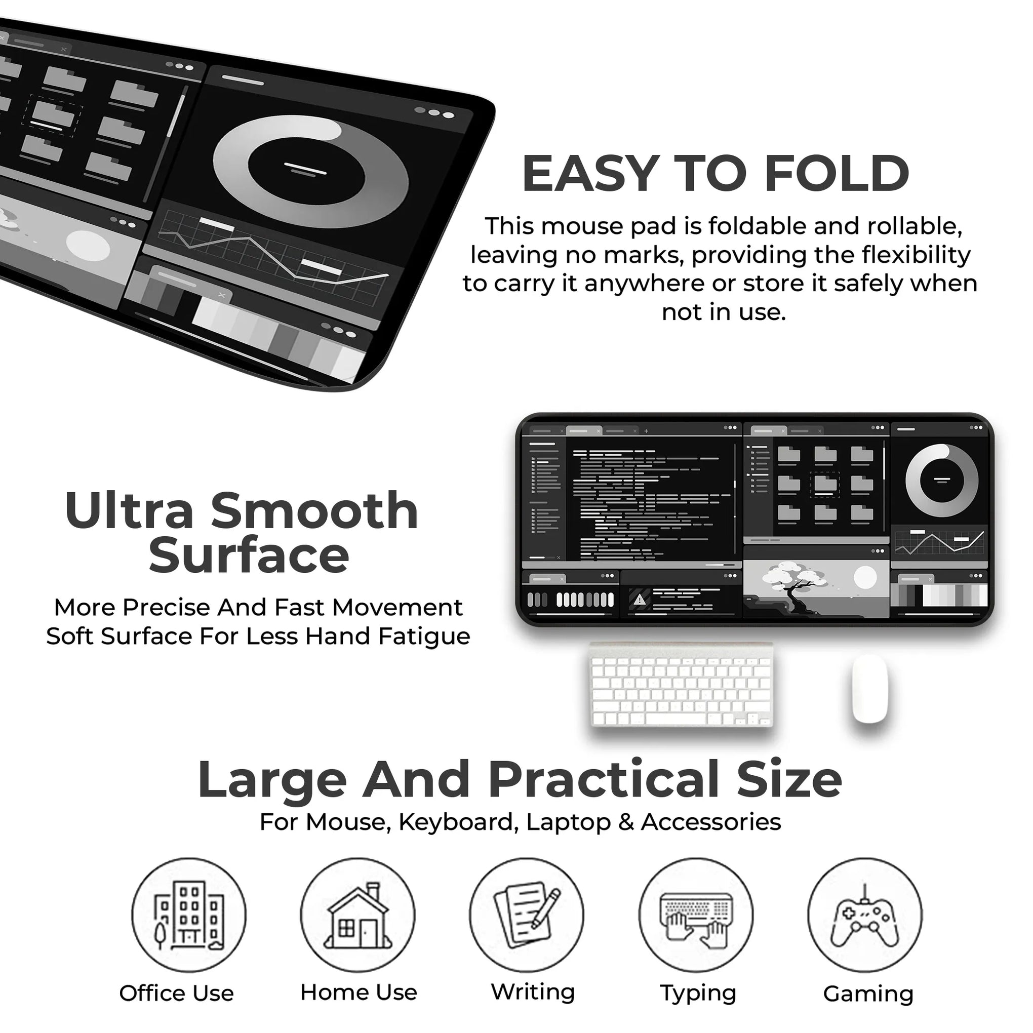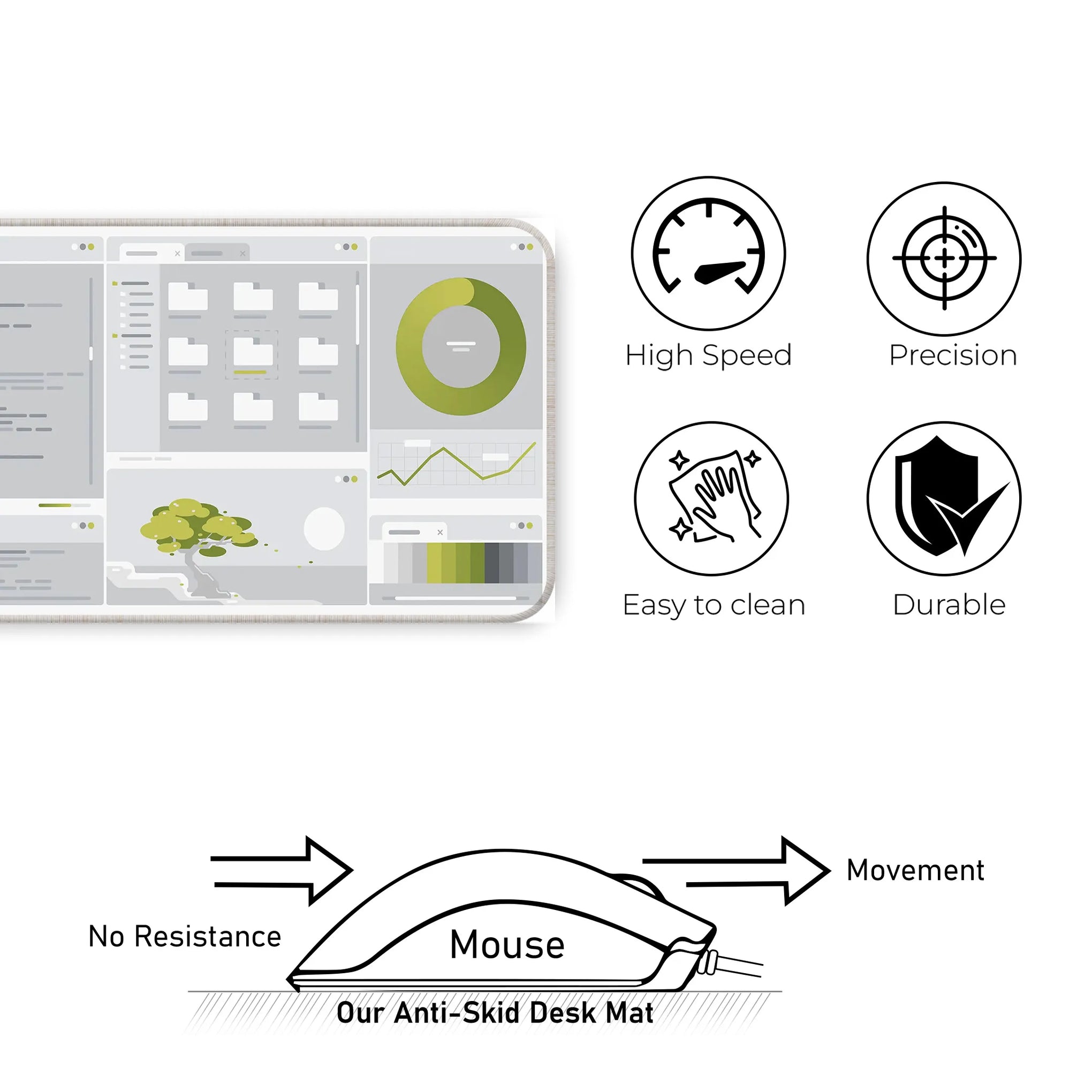 Bring peace to your programming sessions with the Dev Zen Desk Mat, where functionality meets aesthetic clarity. This desk mat mimics a developer's dashboard with open code editors, file explorers, data visualizations, and subtle UI highlights — all framed in a soothing grayscale-green palette. A lone bonsai in the corner adds a calming visual cue, blending tech with tranquility.