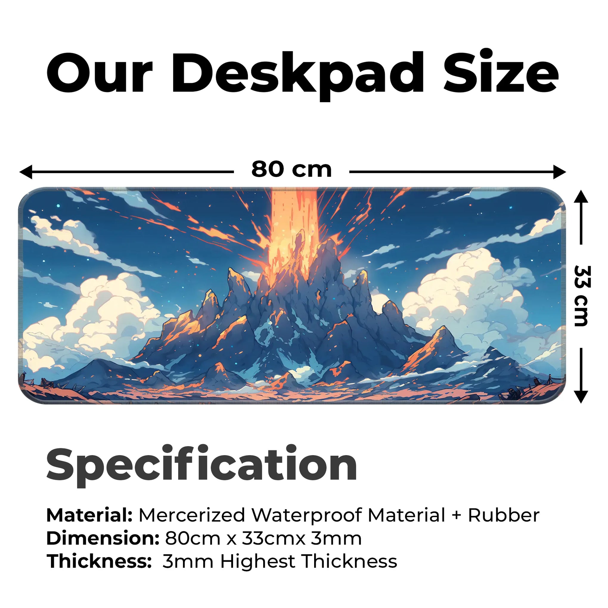 Set your desk ablaze with inspiration through the Exploding Volcano Anime Desk Mat, an AI-generated masterpiece that captures the raw power of nature. This scene showcases a towering mountain mid-eruption, sending lava streaking into the sky, contrasted against a beautiful blue backdrop and thick clouds—an anime-style vision of elemental energy.