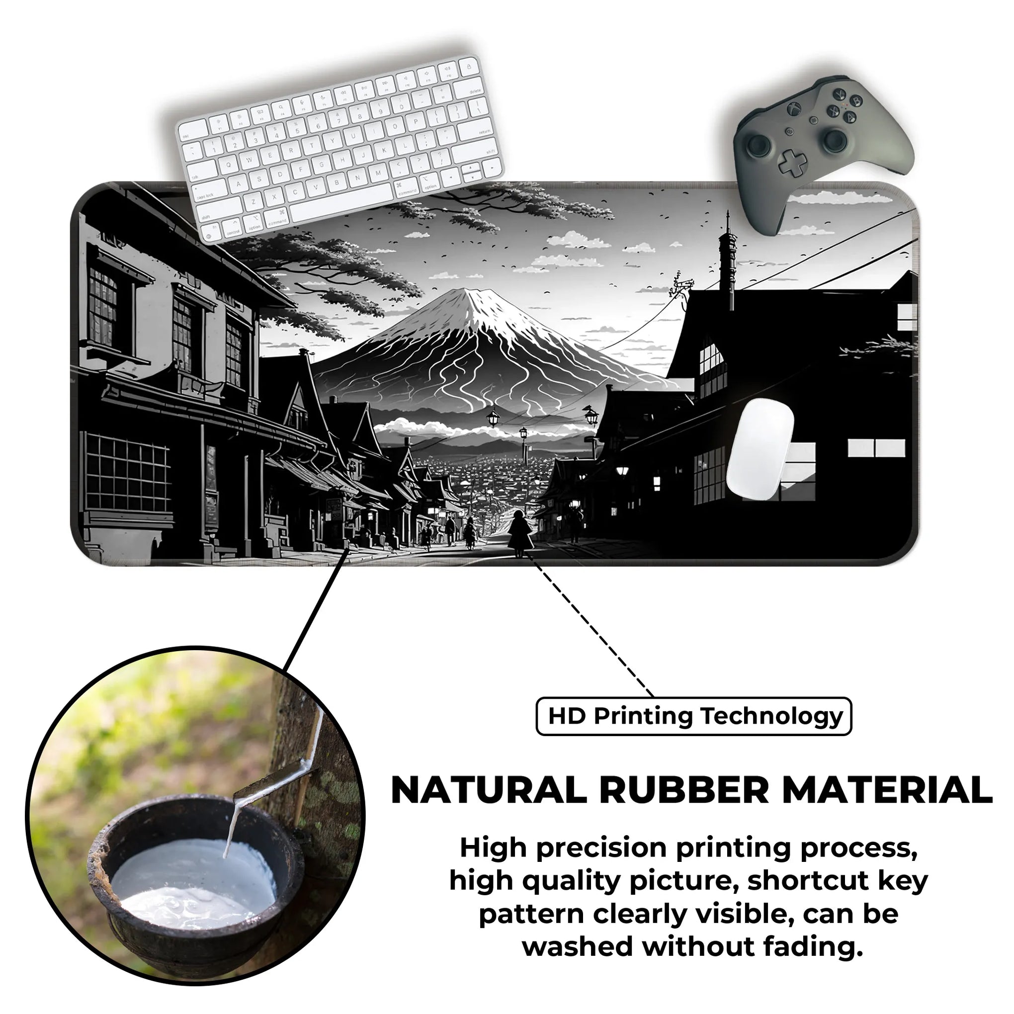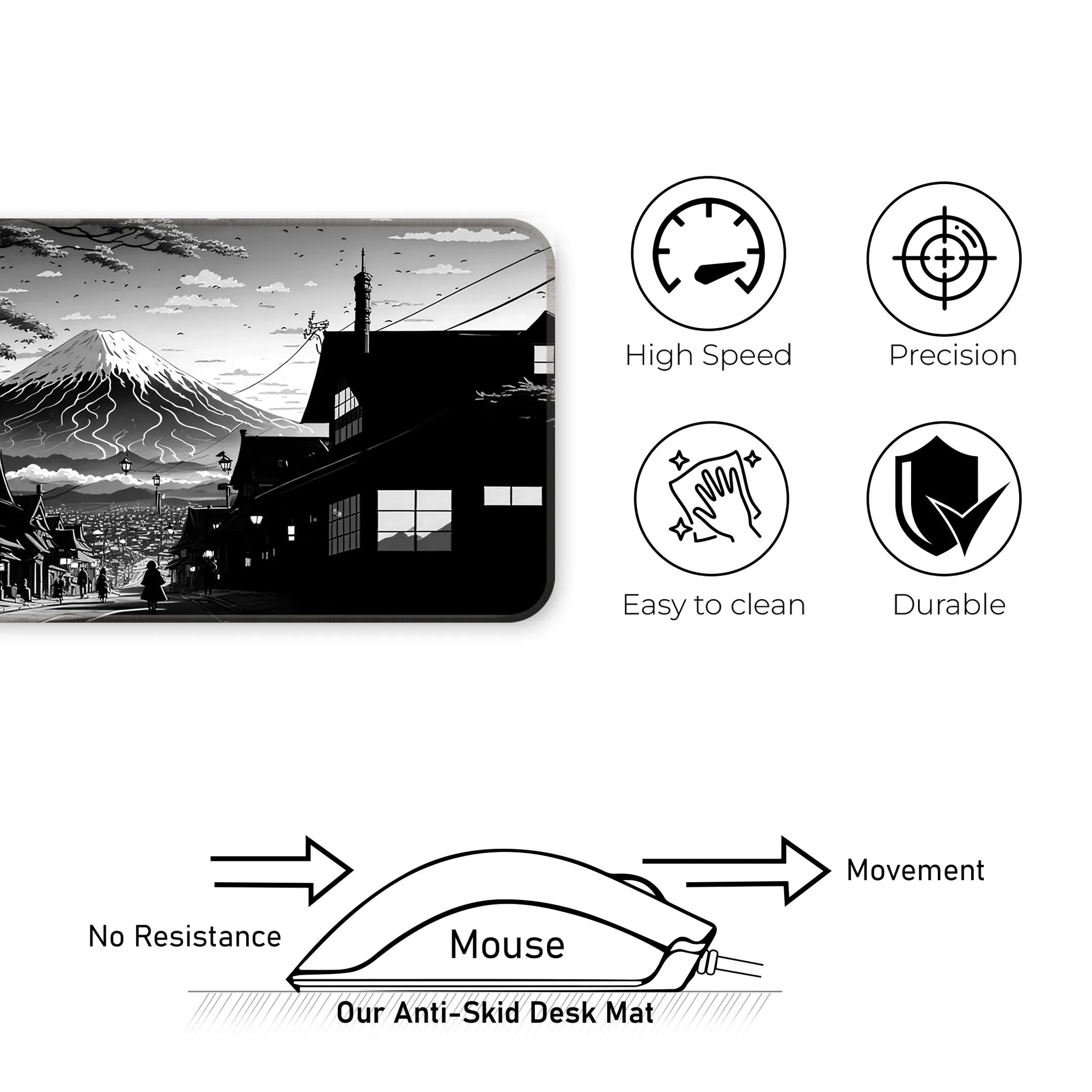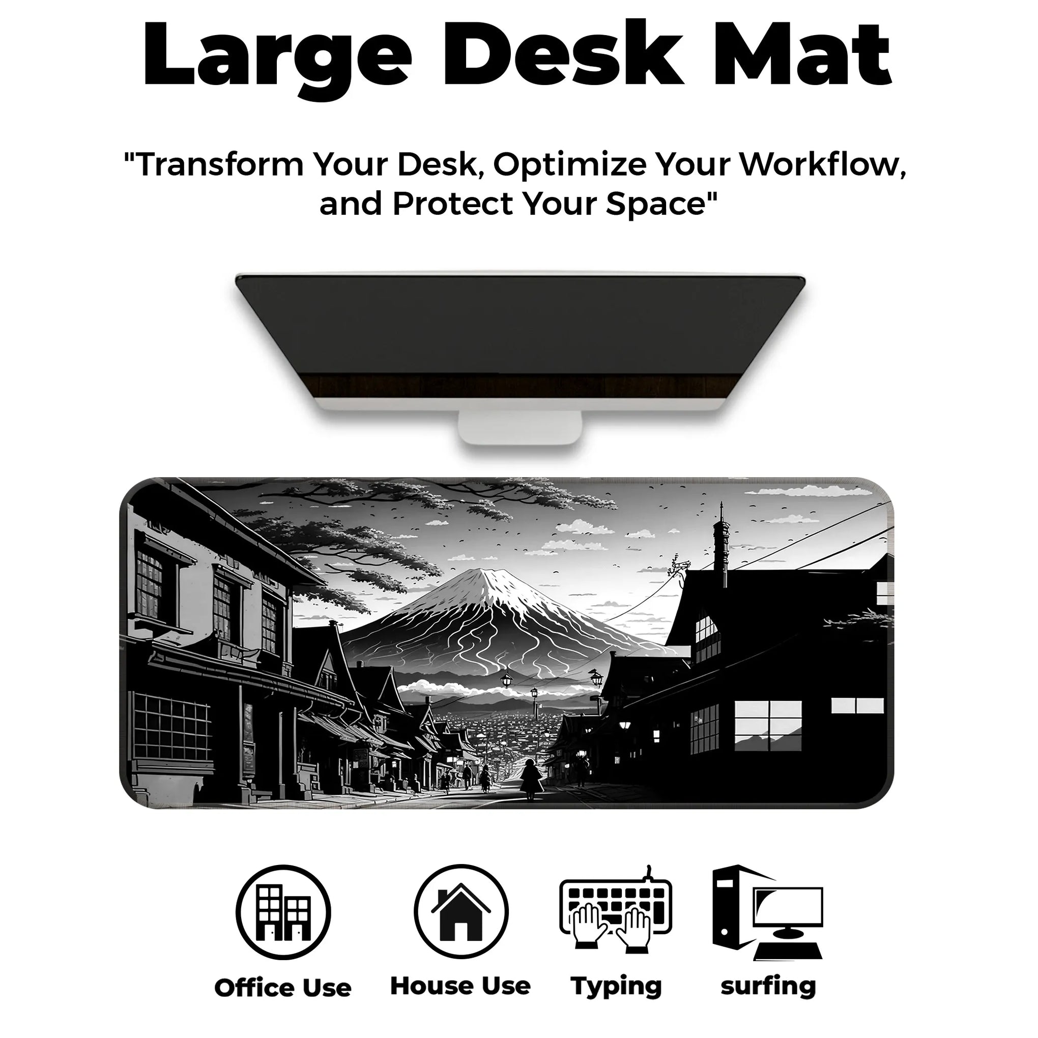 Bring the serenity and strength of Japan’s most iconic landscape to your gaming setup with the Fuji Noir Desk Mat. This breathtaking black-and-white artwork captures a traditional Japanese street leading toward a majestic Mt. Fuji, cloaked in snow and mystery. Inspired by classic manga and ink wash painting, the art style blends the nostalgic charm of Edo-period architecture with modern minimalism.