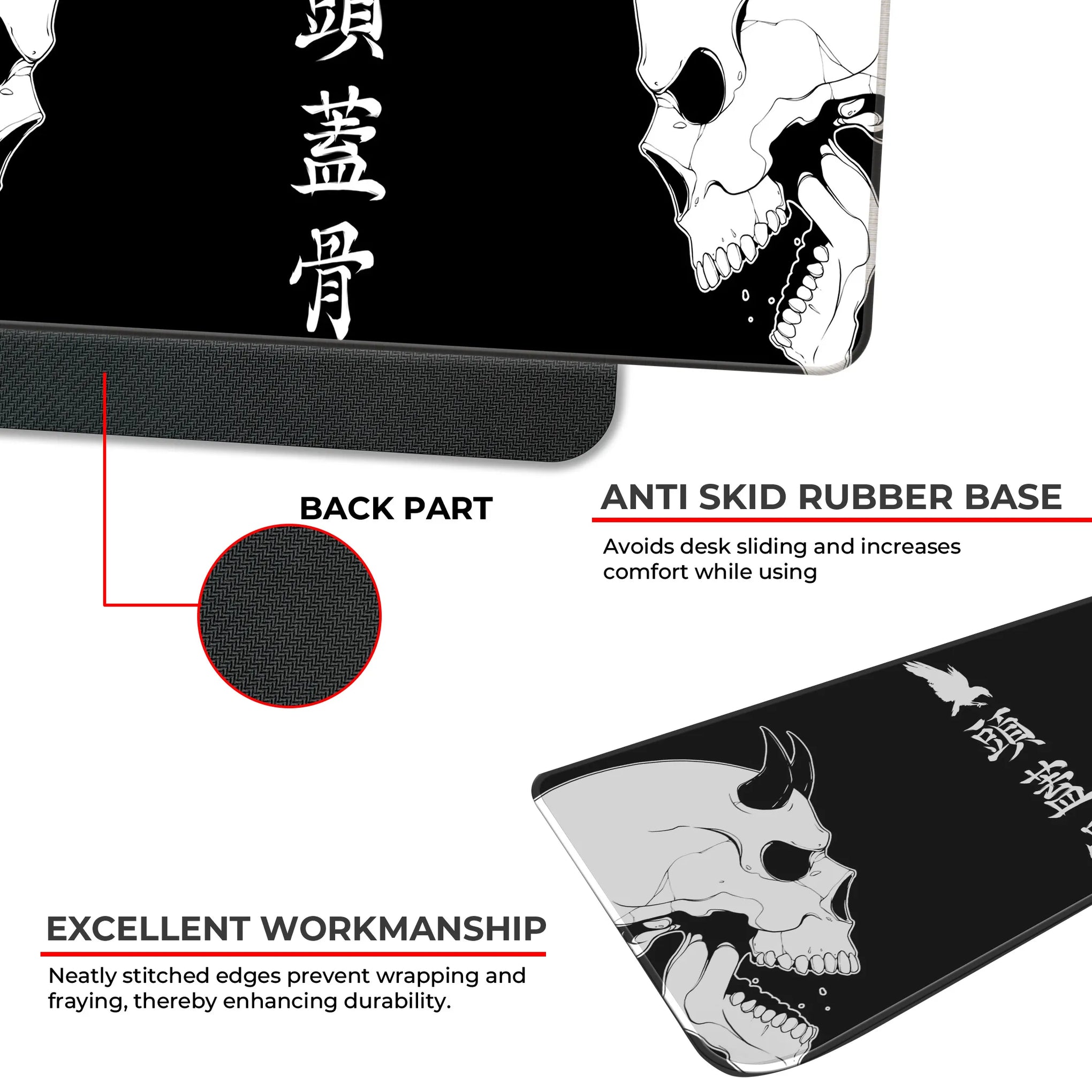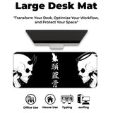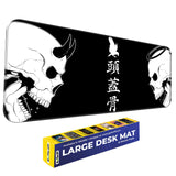 Dive into the eternal conflict of light and darkness with the Heaven & Hell Skull Clash Desk Mat. Featuring two opposing skulls—one crowned with a halo, the other armed with horns—this striking black-and-white artwork captures the essence of duality. The center displays the powerful red Japanese kanji (Zugaikotsu), meaning "Skull", topped with a crimson crow—a symbol of mystery and transformation. This mat is a bold choice for gamers, anime fans, and lovers of dark Japanese art.