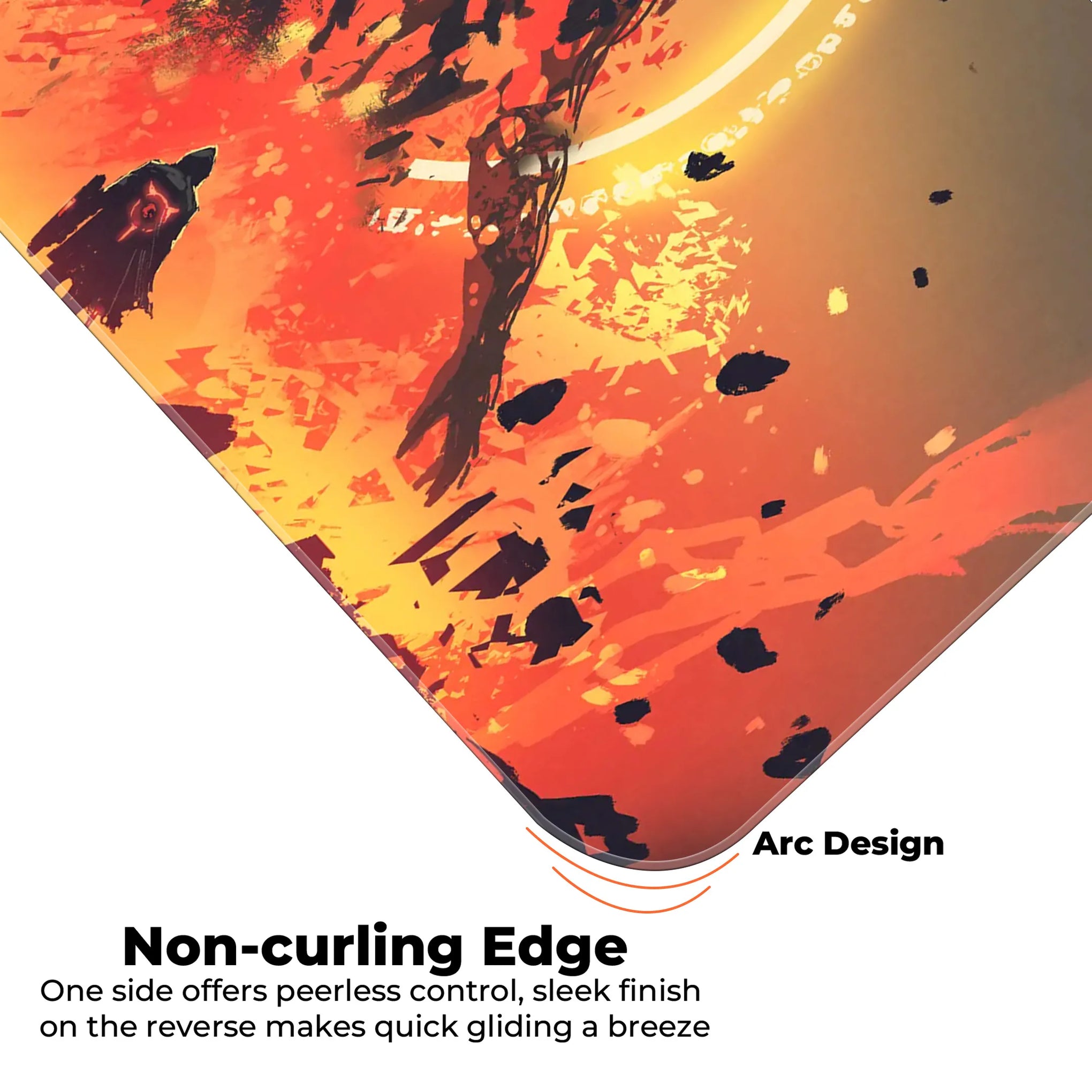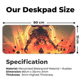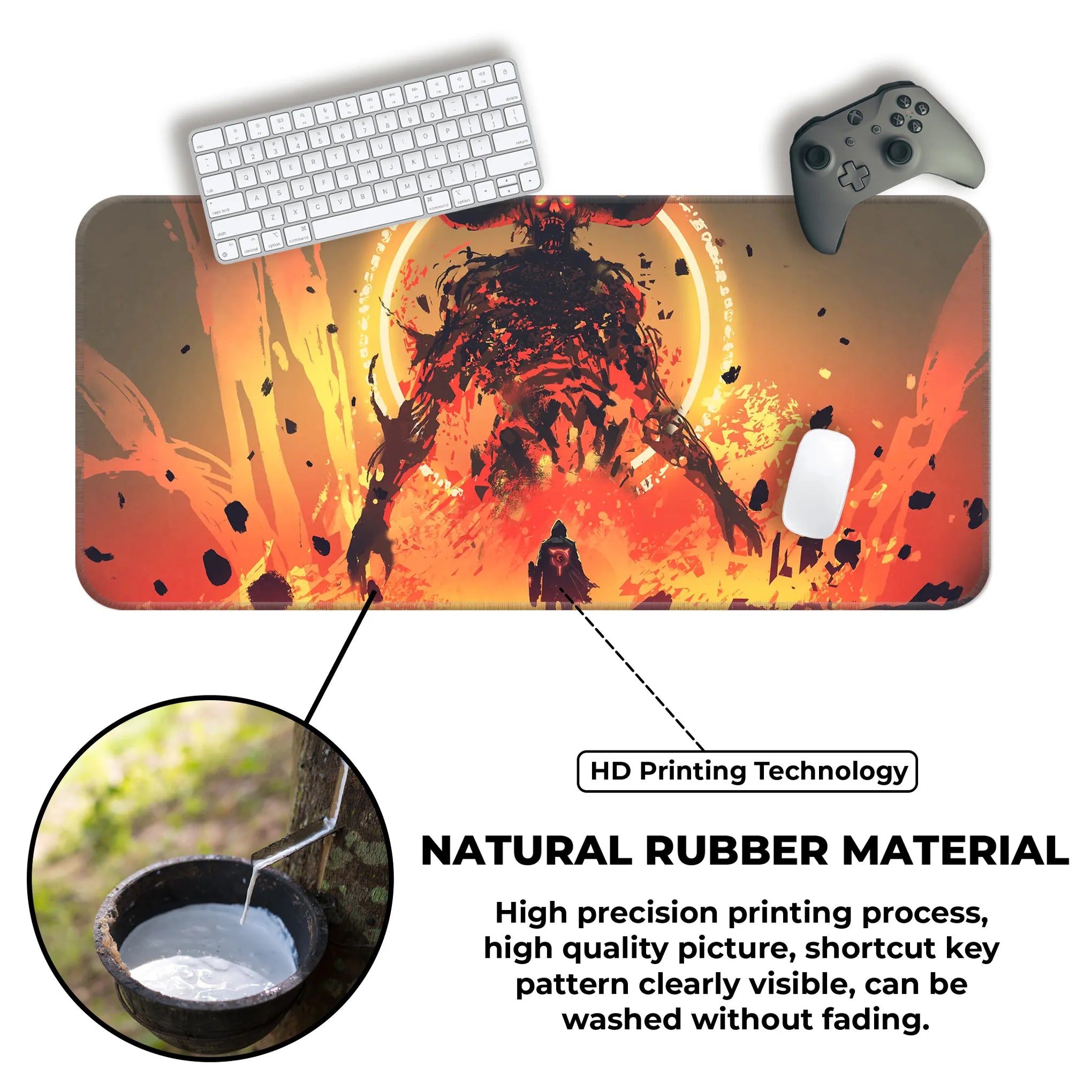 Face the flames of fate with this intense desk mat featuring a dark warrior versus a colossal fire demon. Perfect for fantasy RPG lovers and fans of apocalyptic boss battles.