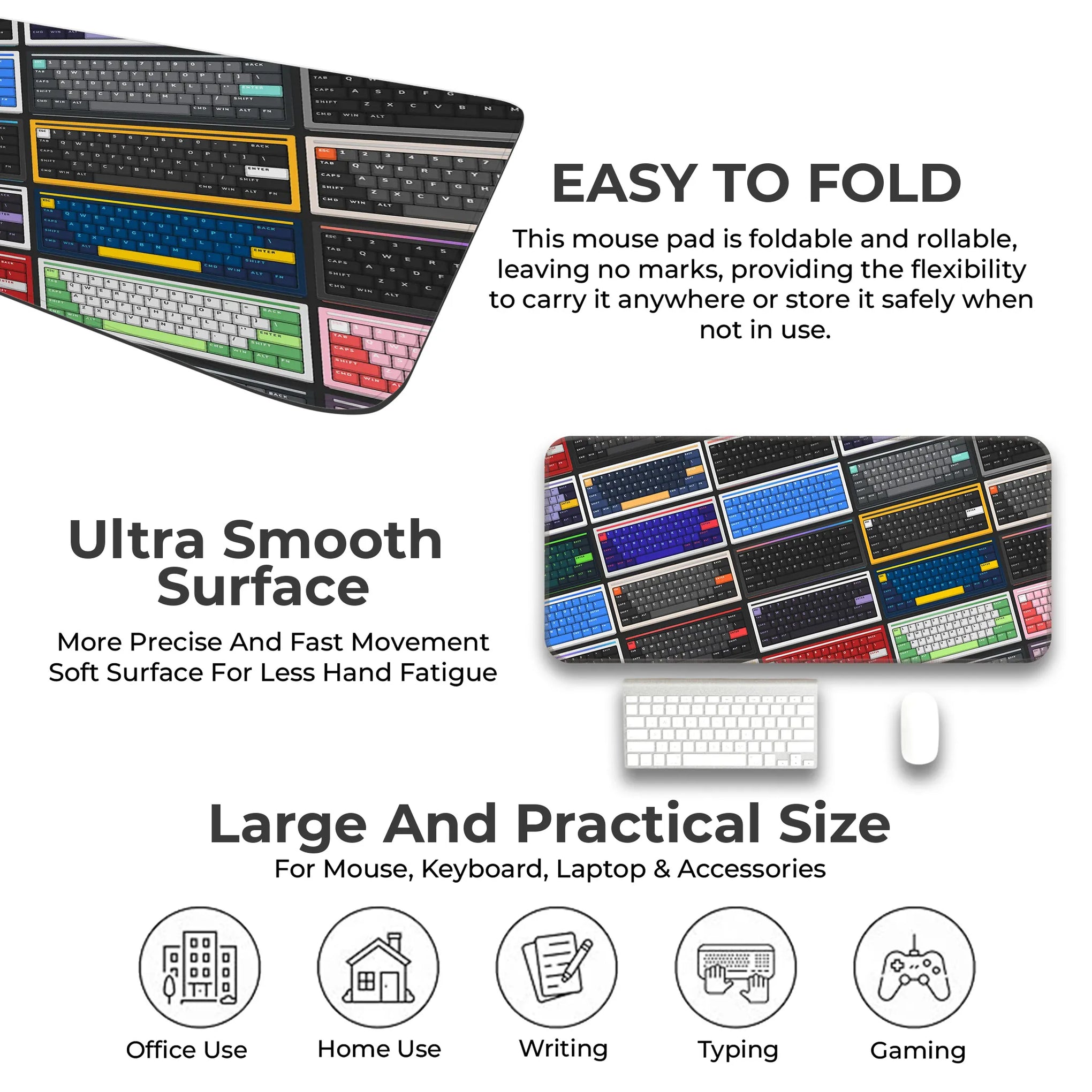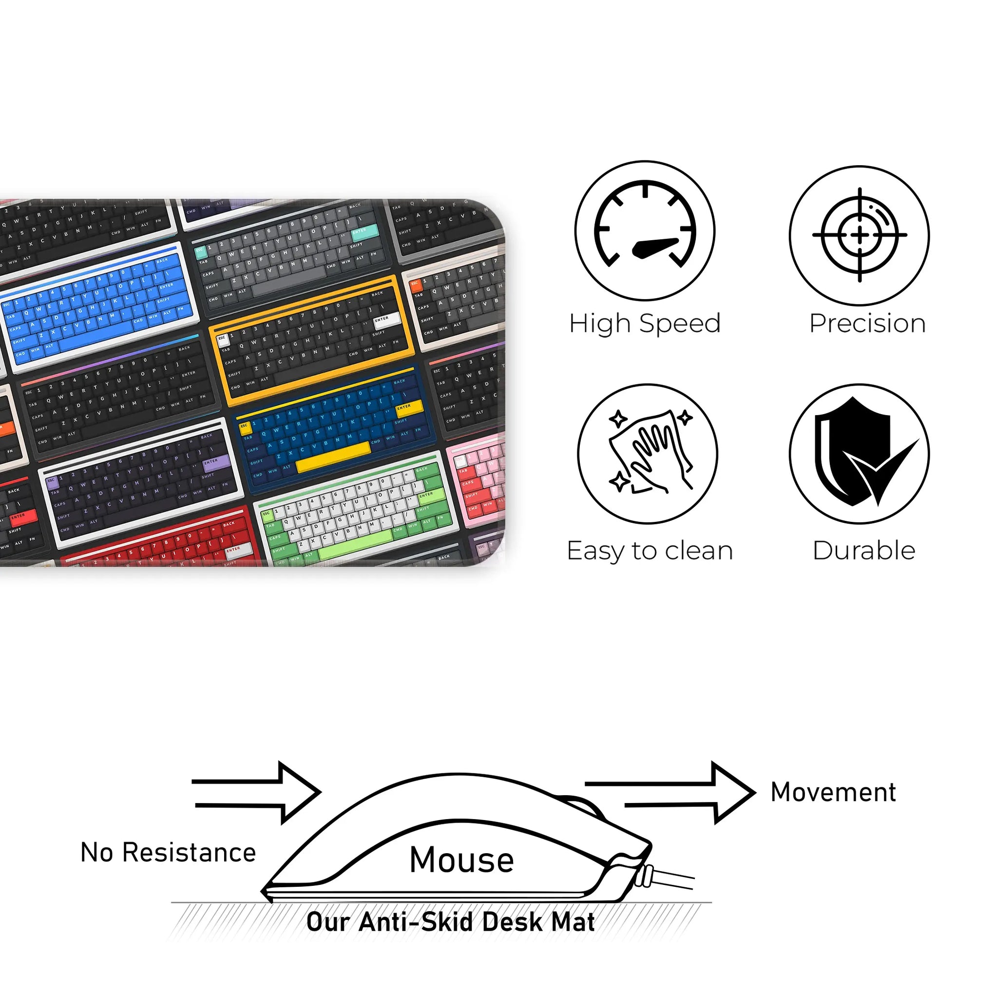 A vibrant visual of mechanical keyboards in every color combo imaginable. This desk mat is a must-have for keep enthusiasts and RGB custom build fans.