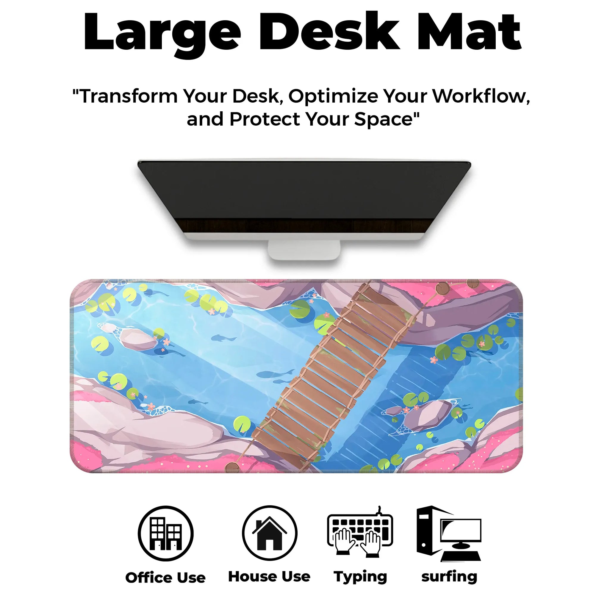 Let your workspace flow with calm and clarity through our Serene Koi Pond Desk Mat, inspired by the gentle rhythm of Japanese nature. This overhead art piece features a beautifully crafted wooden bridge crossing over crystal-clear turquoise waters filled with koi fish, blooming lilies, and floating petals – a design that soothes the soul and sparks peaceful focus.